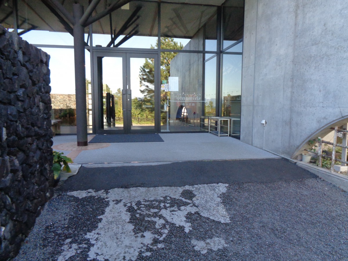 正面入口 入口前に傾斜の急なスロープがある 下の駐車場に停め、下の入口を利用した方がラク