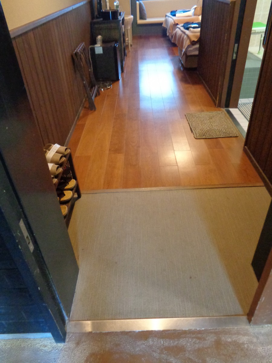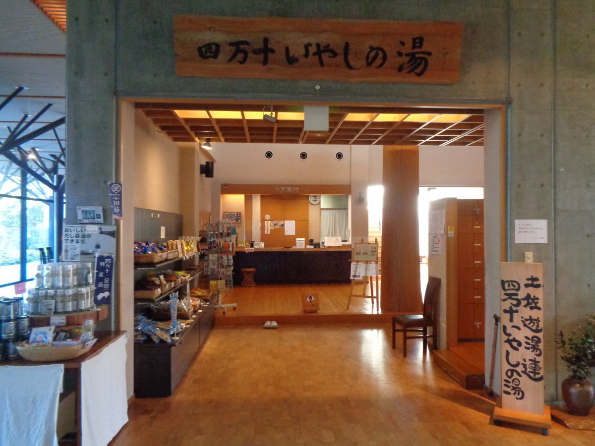 館内の温泉施設「四万十いやしの湯」 受付があるフロアに靴を脱いで上がる フロアは1段高くなっているが、スロープがある