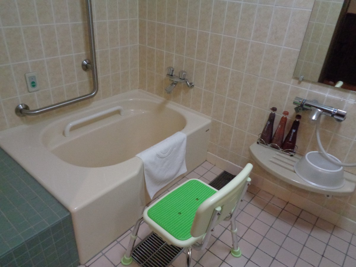 天海 トイレはお風呂と一体型で段差がなく中は広い 福祉用具も配慮がある