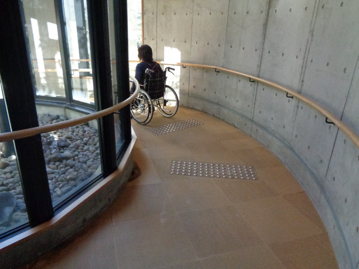 受付後、浴場へはスロープを降りて行く 傾斜がややきつく距離が長いため、介助者が一緒の方がよい