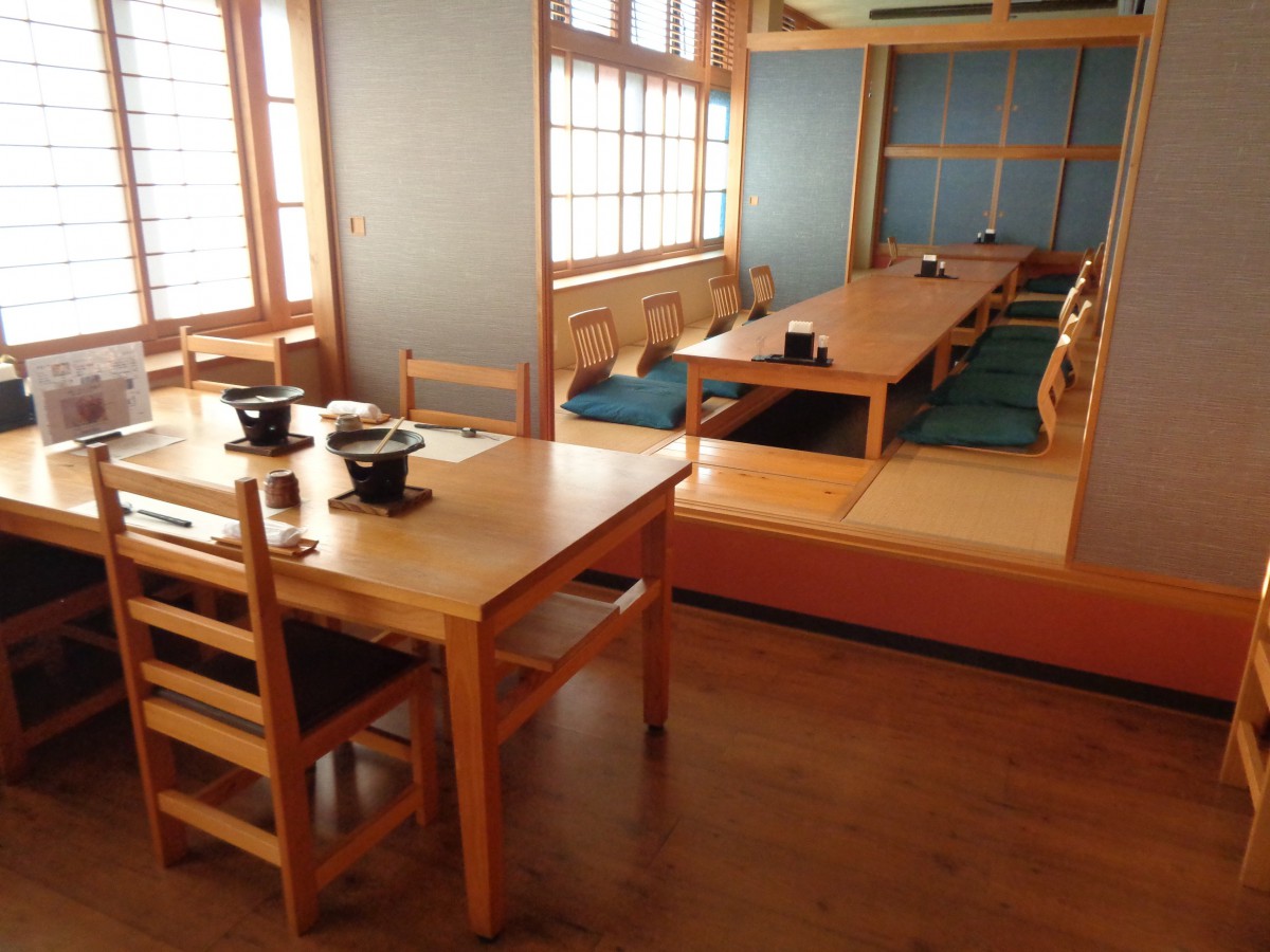 レストラン山川海 テーブル席と座敷がある テーブル席の方はパーテーションで細かく区切られた造りで、通路は十分に広い