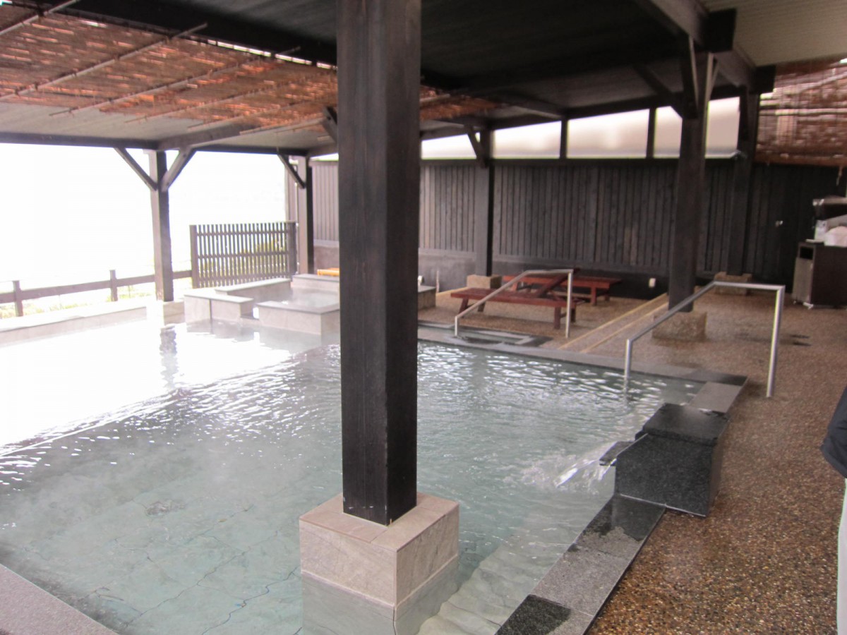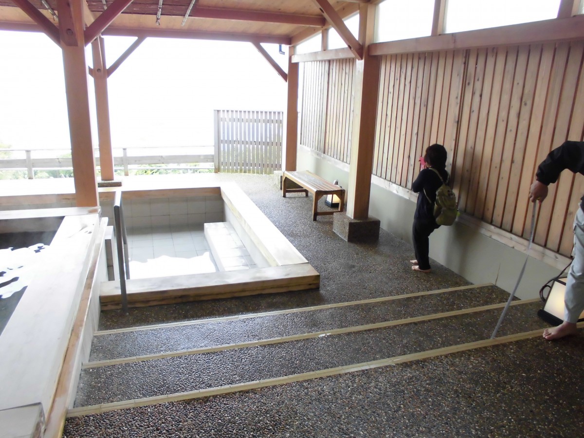 大浴場 ヒノキの露天風呂 海に面していて眺望がとても良い 浴槽の入り口に手すりあり