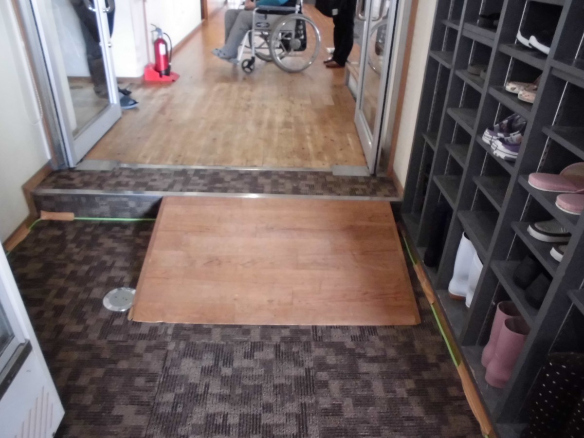 正面玄関内 段差があるため、車いす利用の方には東側の出入口を案内する