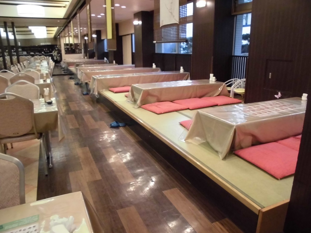 レストラン ランチタイムはバイキング形式 配膳時に利用できる木製カート(子ども用2台、大人用2台)あり