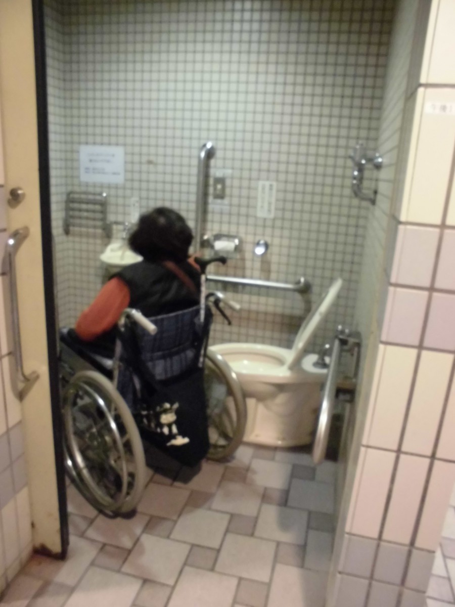 デンテツターミナルビル地下1階 多目的トイレ サービスセンターを出て土電ビル西側のエレベーターで降りる 出入口ドアの鍵が高い位置にあるため介助者の付添をおすすめ
