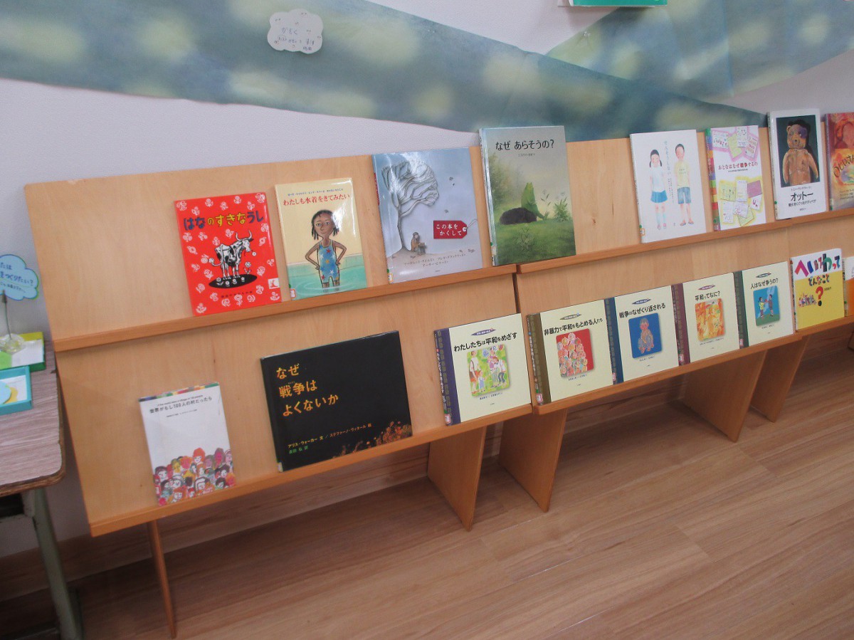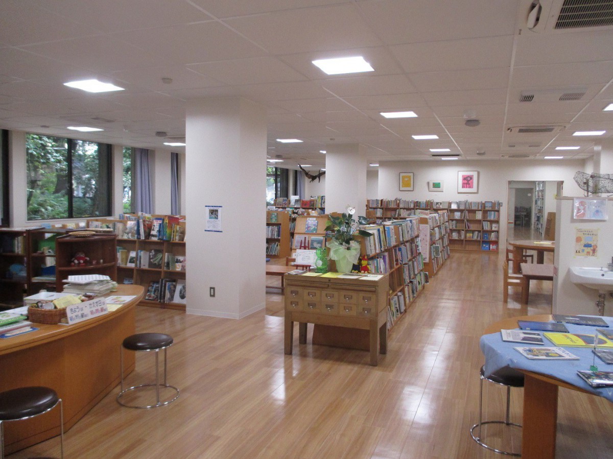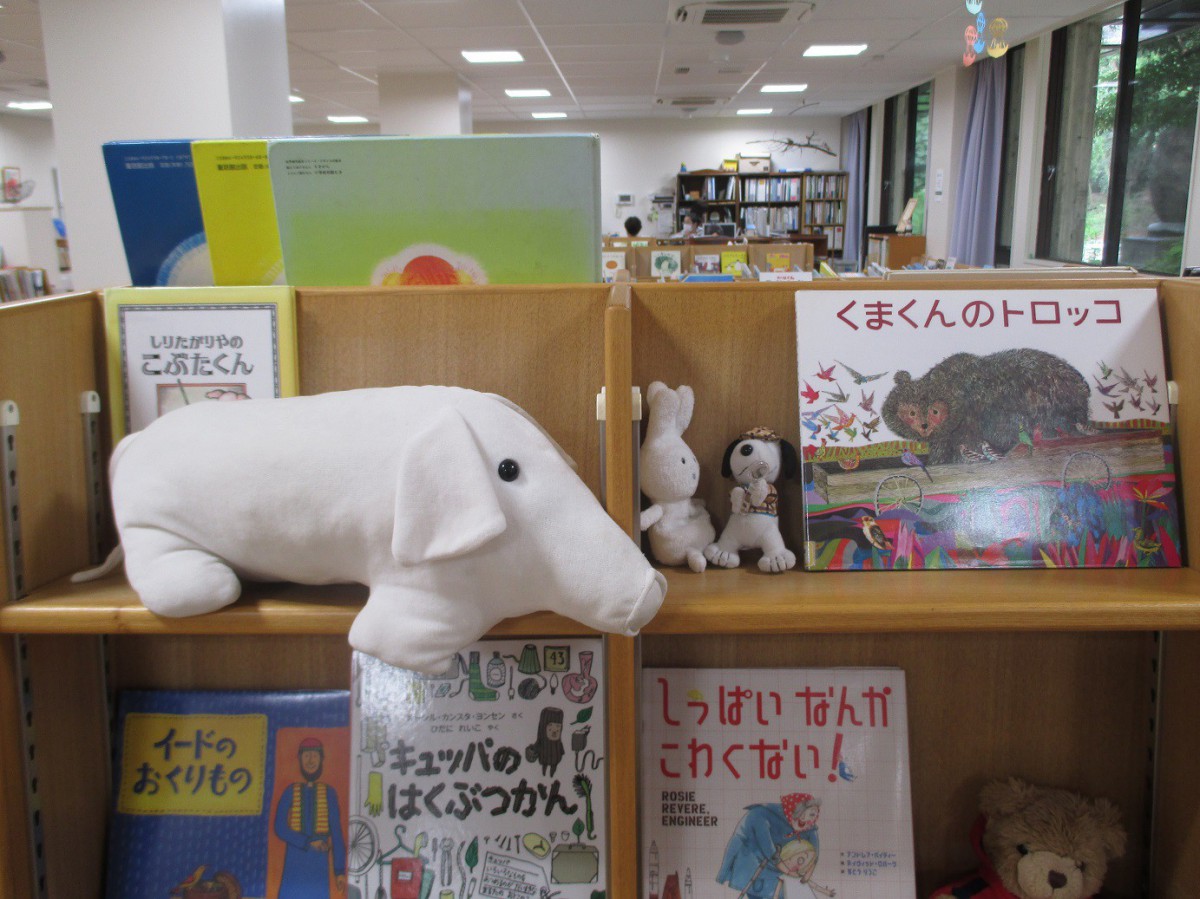 あとりえほんのコーナー こどもの図書館の自主企画展のほか、月によって、アーティスト(イラストレーターやフェルト作家さん等、様々な作家の方々)の個展も行う予定