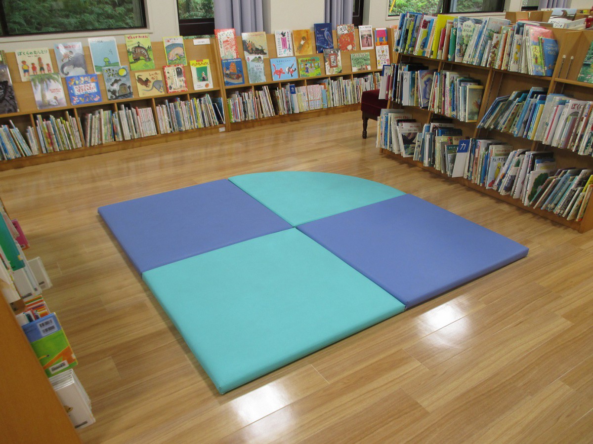 児童書コーナーにキッズスペース マットがありのびのび遊べる