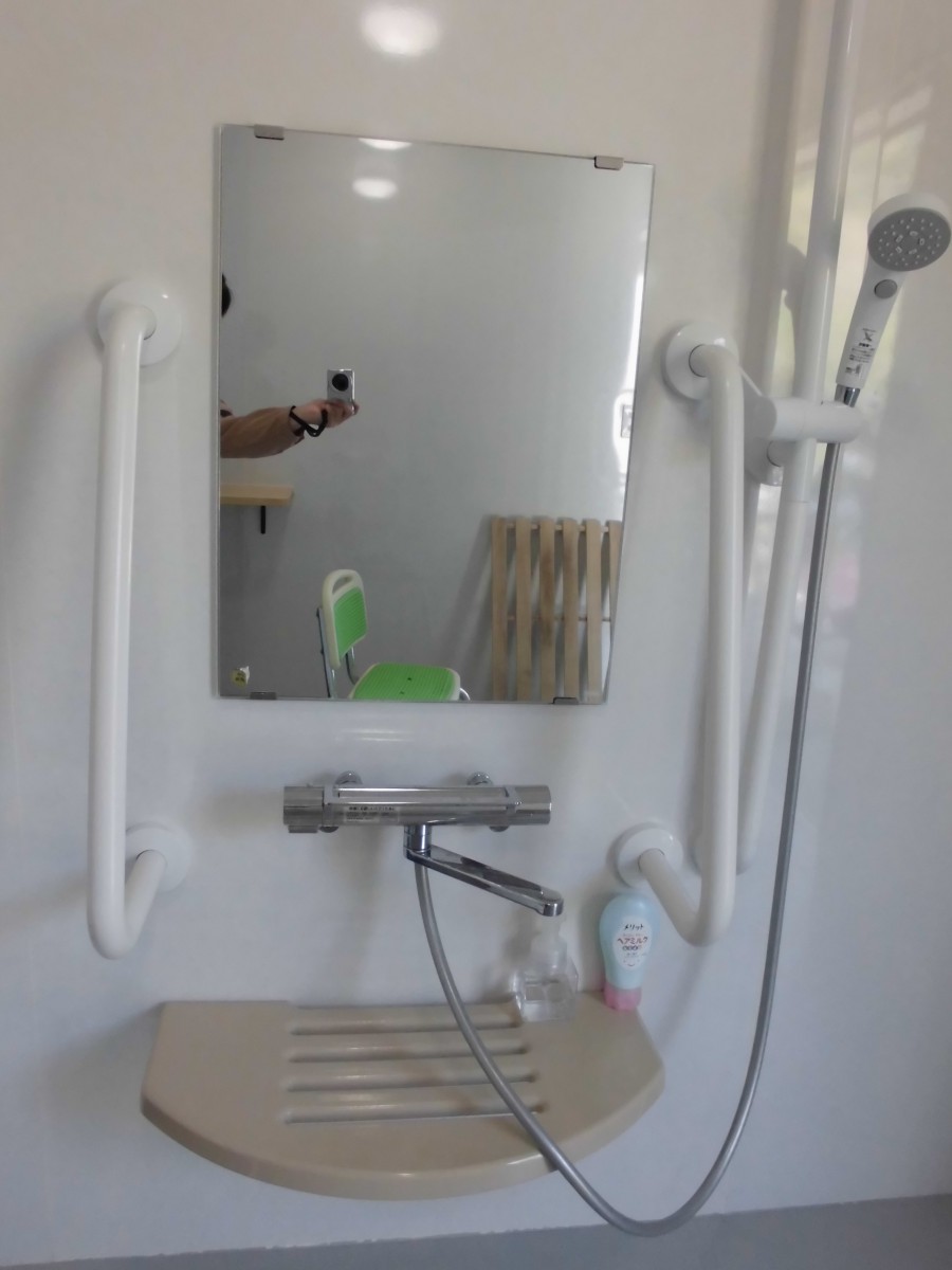 バリアフリー対応シャワー室 鏡の両脇にL字の手すりあり