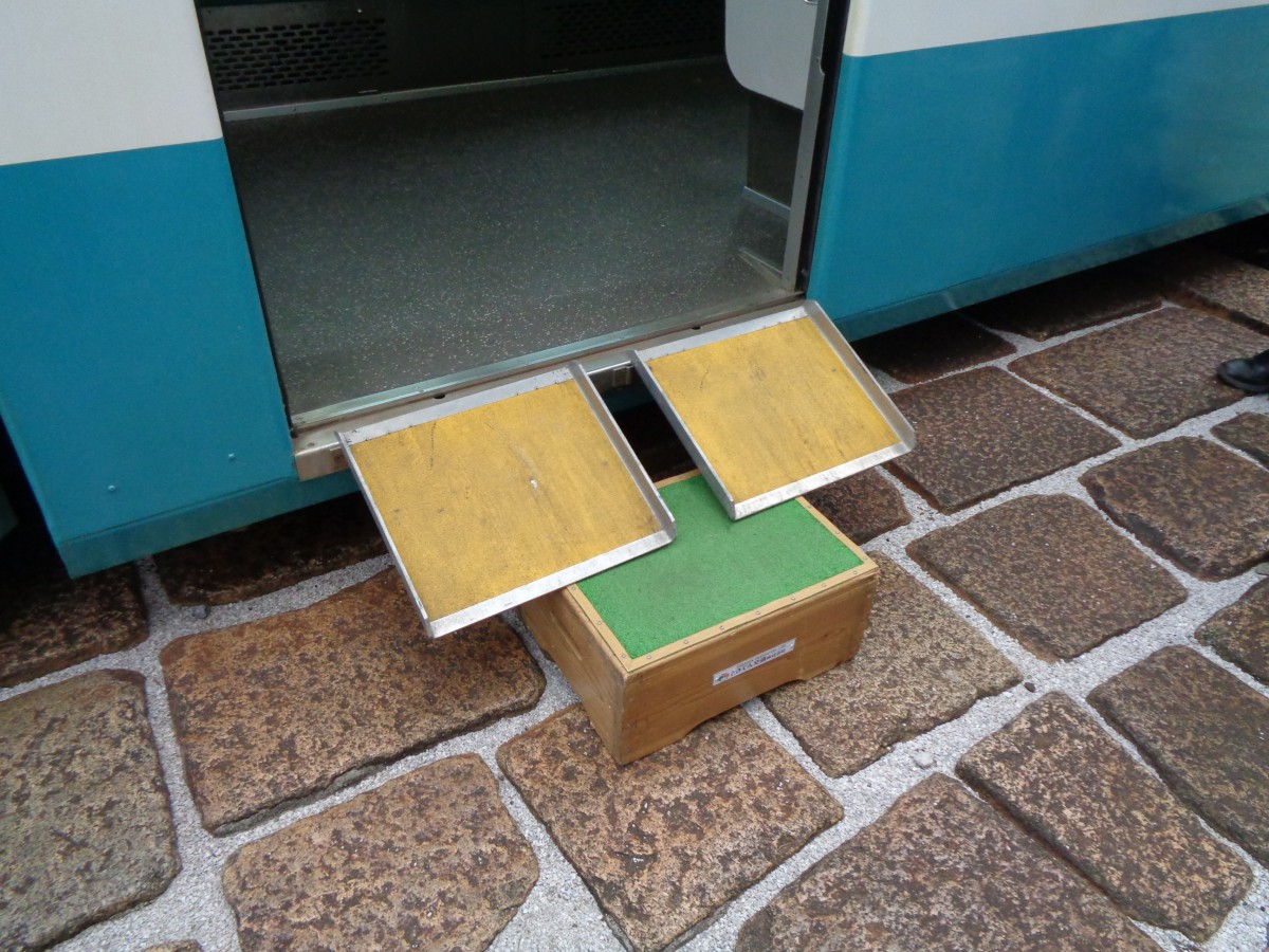 ハートラムⅡ(3002号)車内 車いすスペース 収納腰掛けとなっており、スペース使用時にはペダルで折りたたむことができる。横には、優先座席あり。