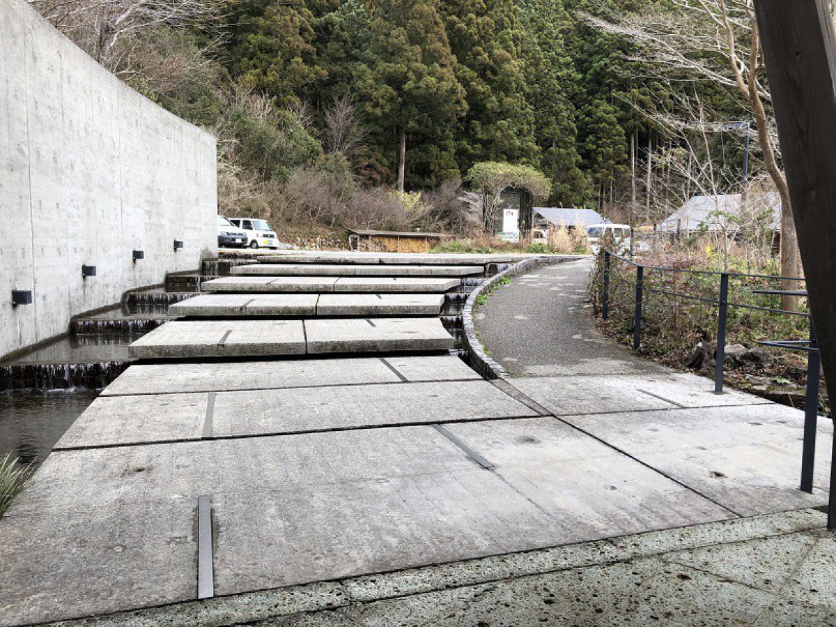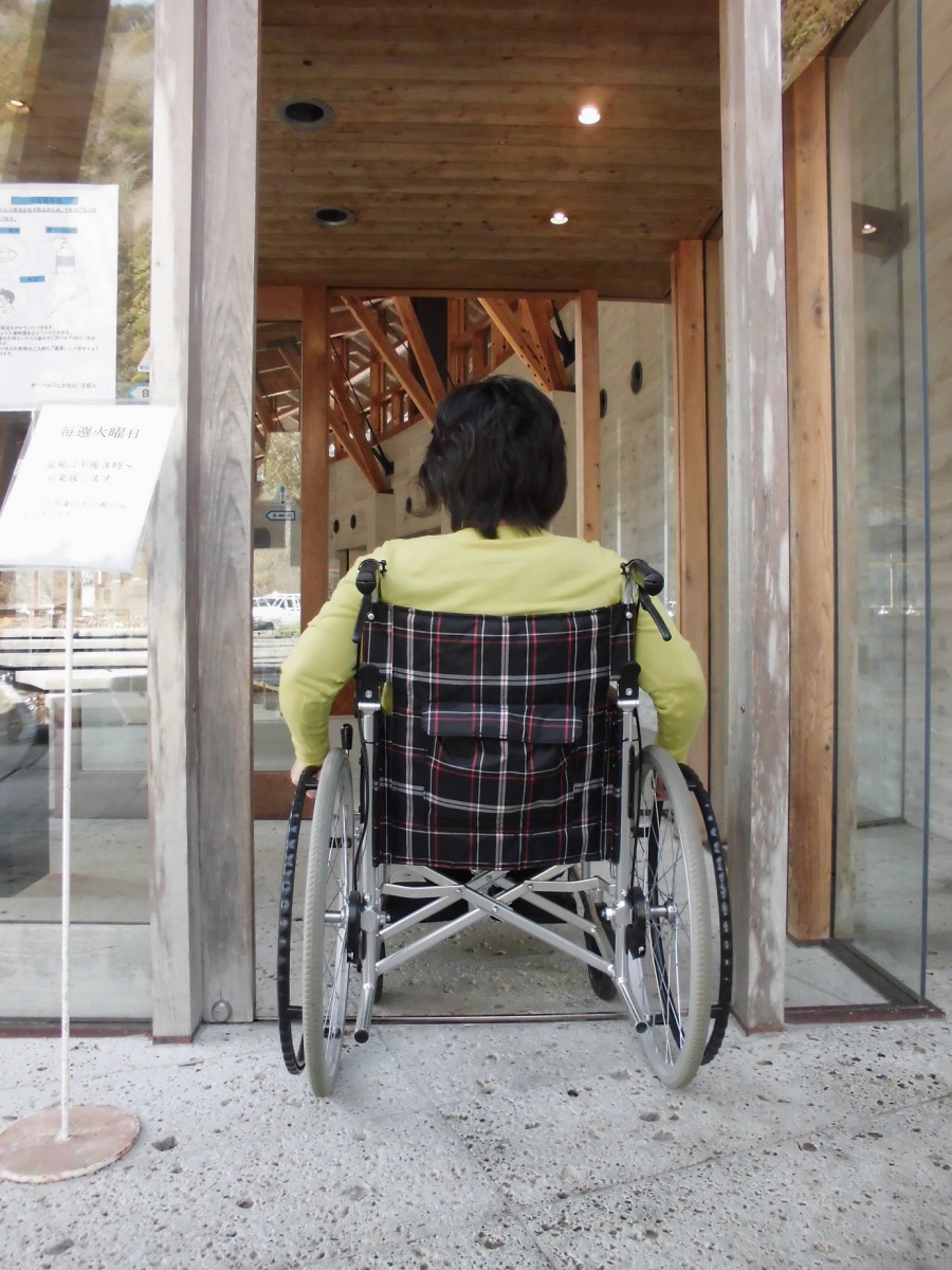 ホテル入口前 段差5段 スロープあり 傾斜1.5~5度 溝があるため車いすタイヤや杖の使用は注意が必要