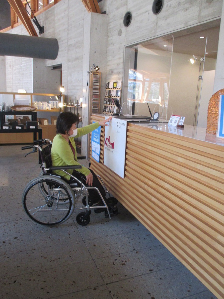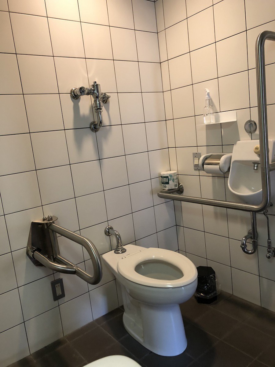 1階レストラン横 多目的トイレ スライド戸 入口幅87センチ 便器に向かって右にL字固定 左に可動式U字手すりあり