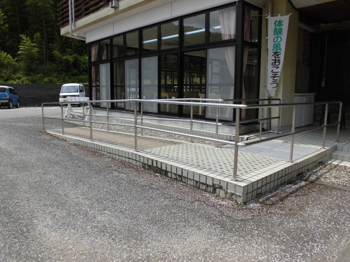 研修棟 入口 段差あり 2段 スロープあり スロープ幅115センチ 長さ270センチ 傾度4~5度