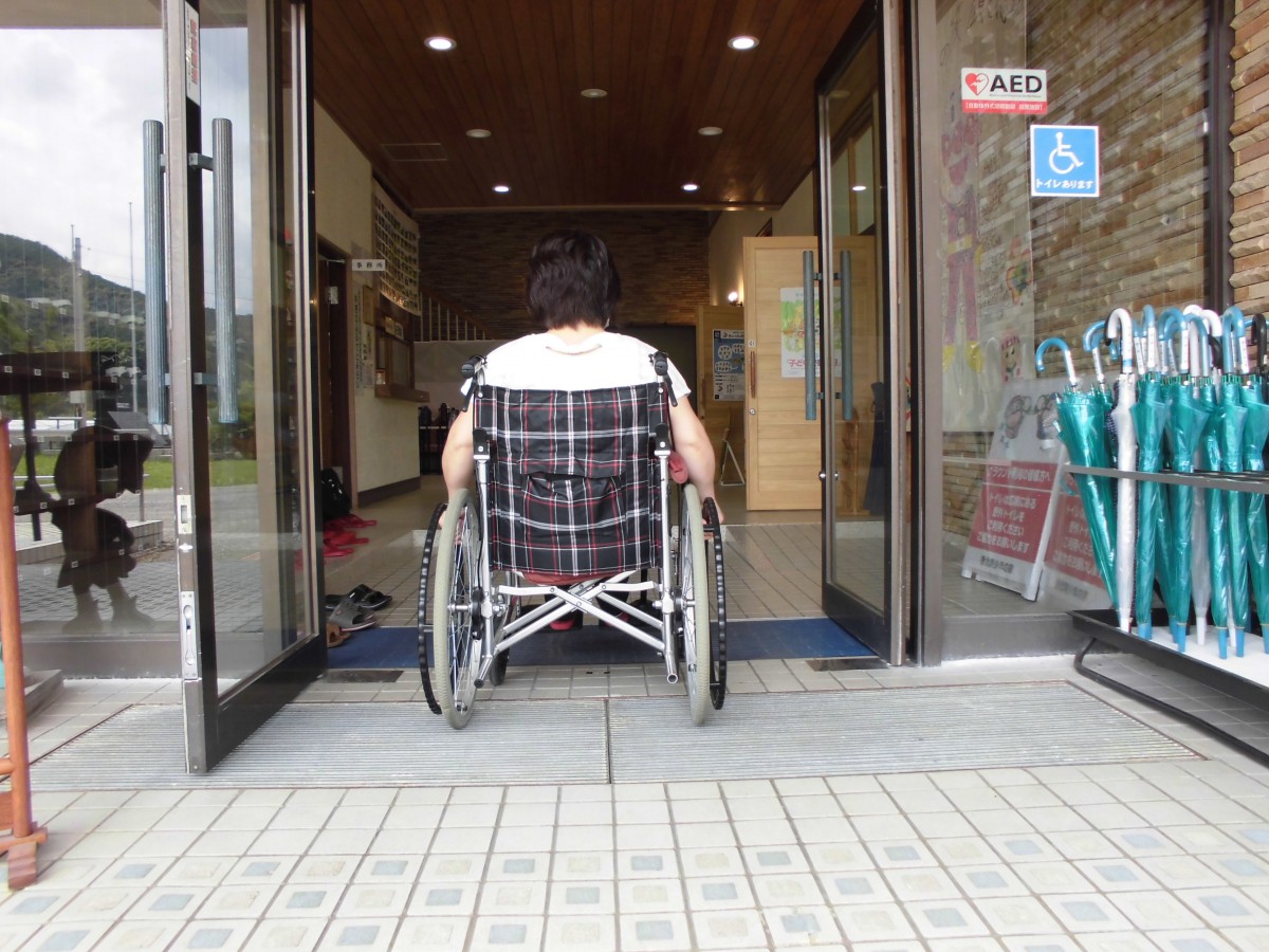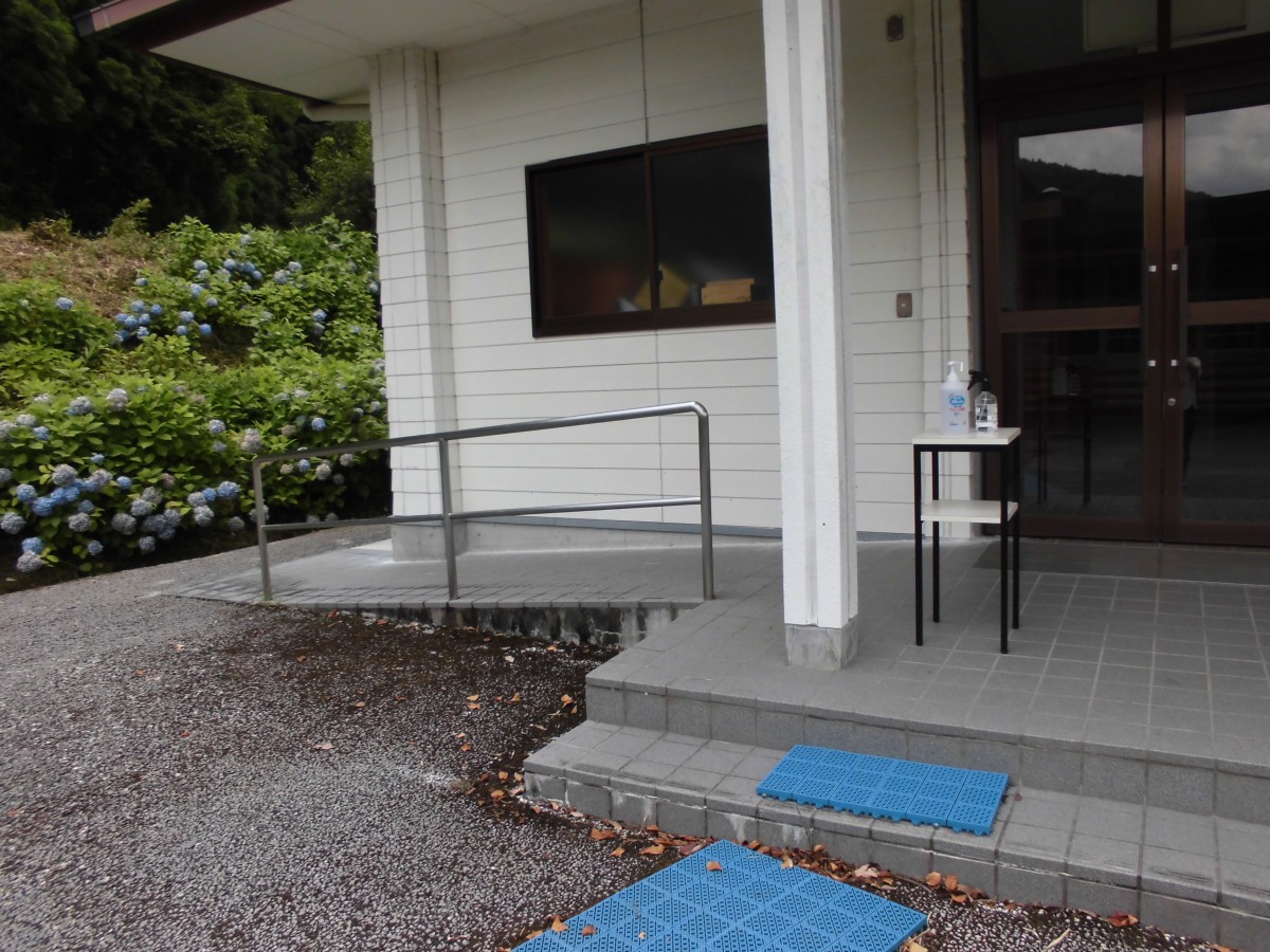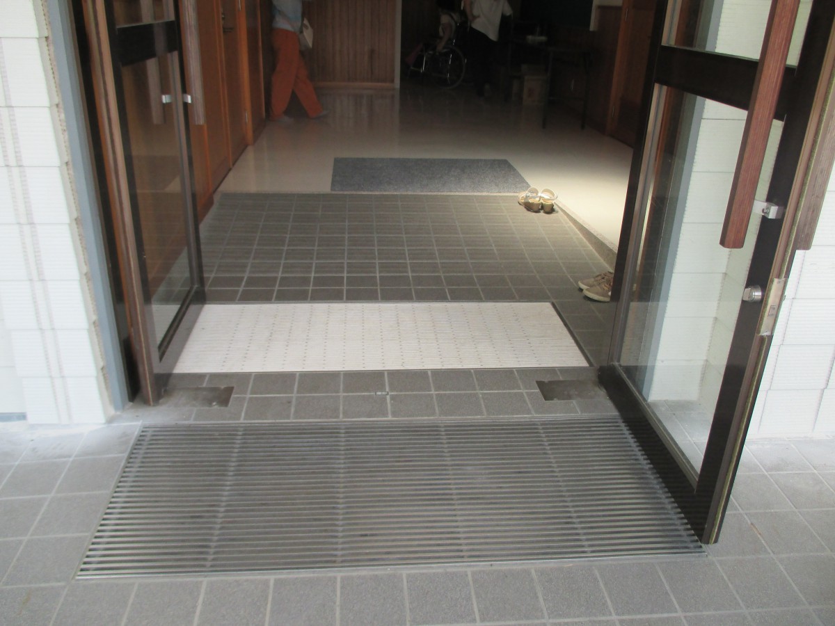 研修棟 入口 両開き戸 入口幅143センチ 段差なし スロープあり傾度5度