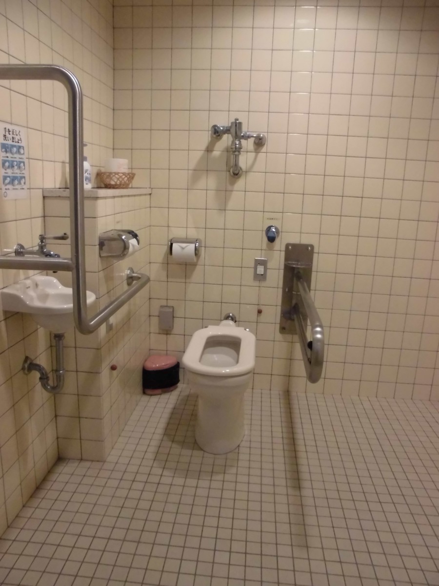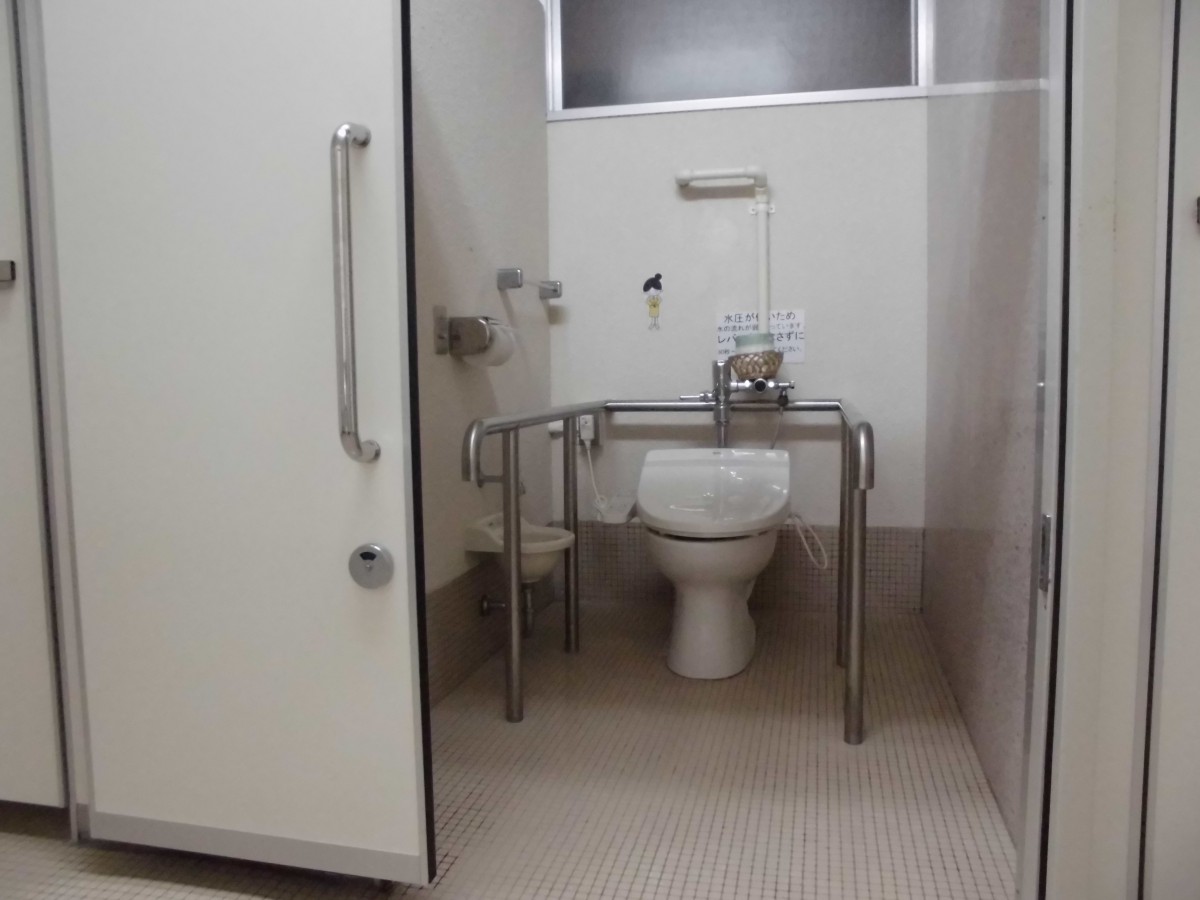 別館 一般女子トイレ 個室スライド戸ドア幅81センチ 便器に向かって左右に固定のI字の手すりあり 一般男子トイレも同じ造り