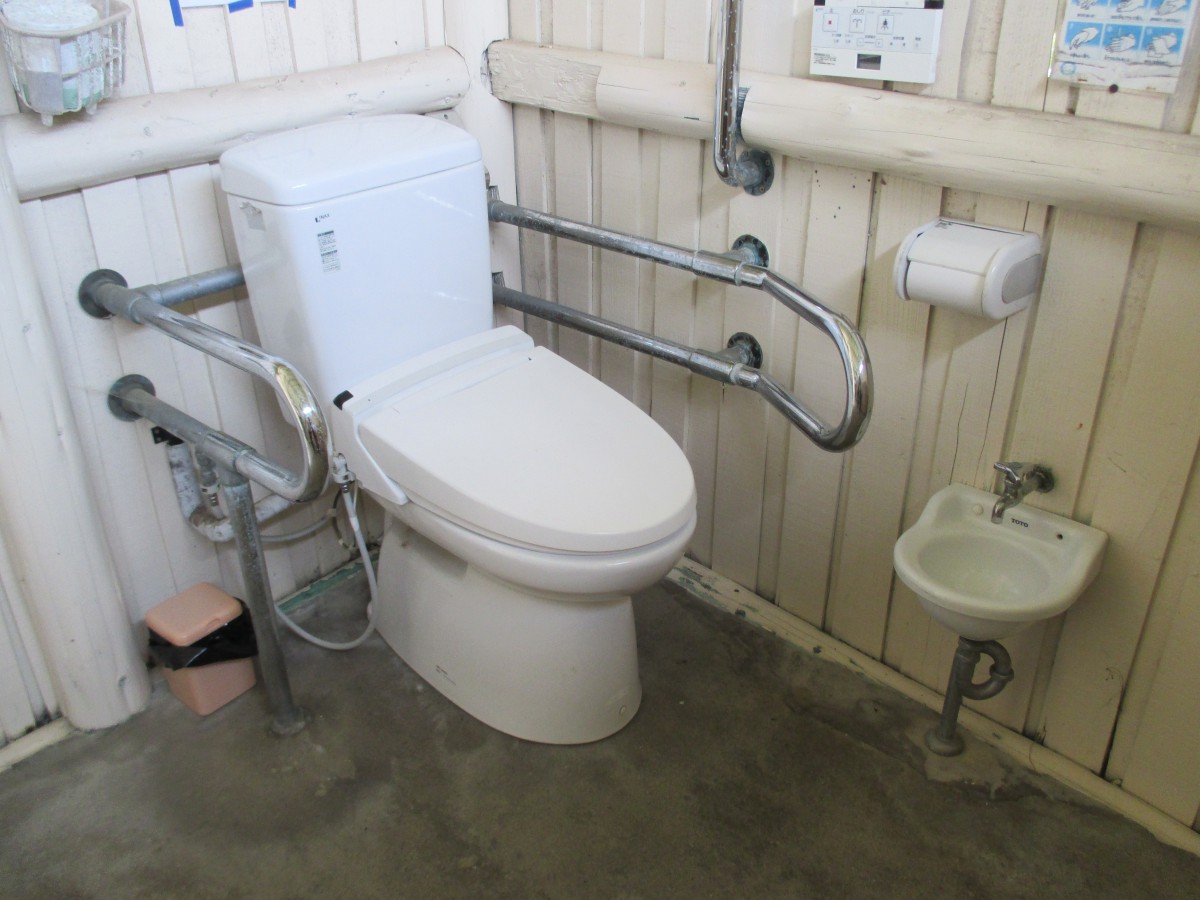 大広場 野外トイレ車いす対応トイレ 扉はアコーディオンカーテン 入口幅は十分広い 便器に向かって右に固定の縦I字とU字 左に固定U字の手すりあり