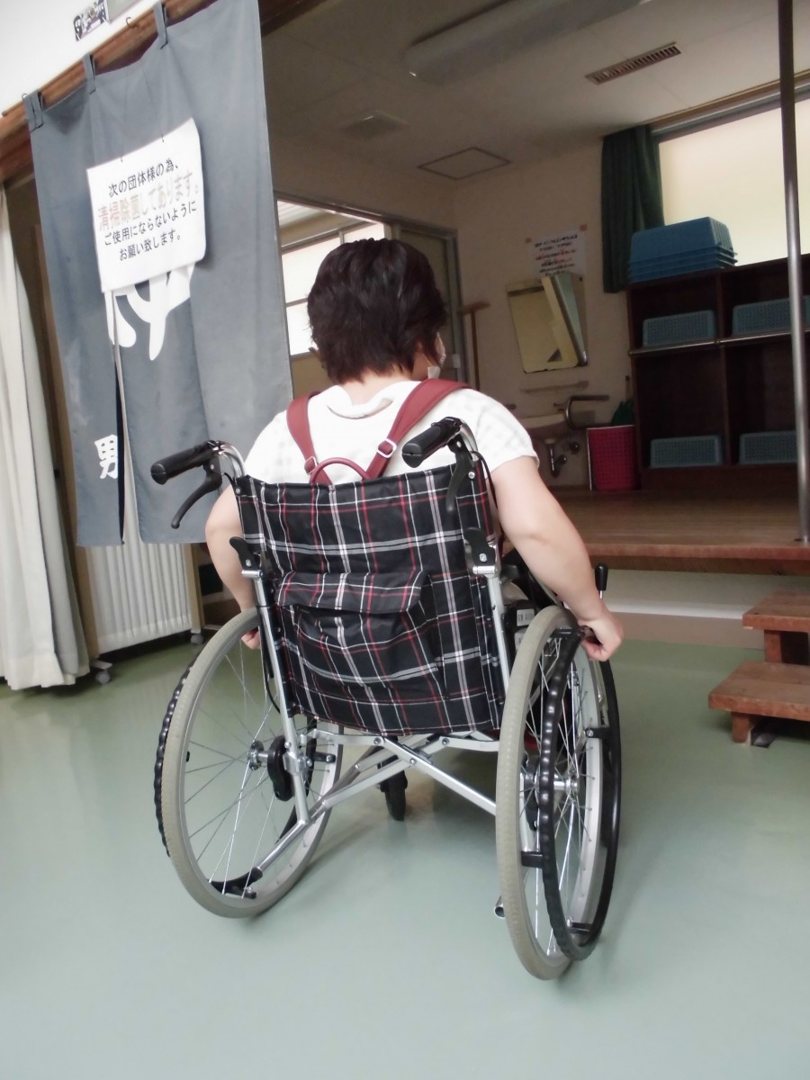 研修棟 身障者トイレ スライド戸 入口幅83センチ 便器に向かって右に可動式U字 左に固定L字の手すりあり