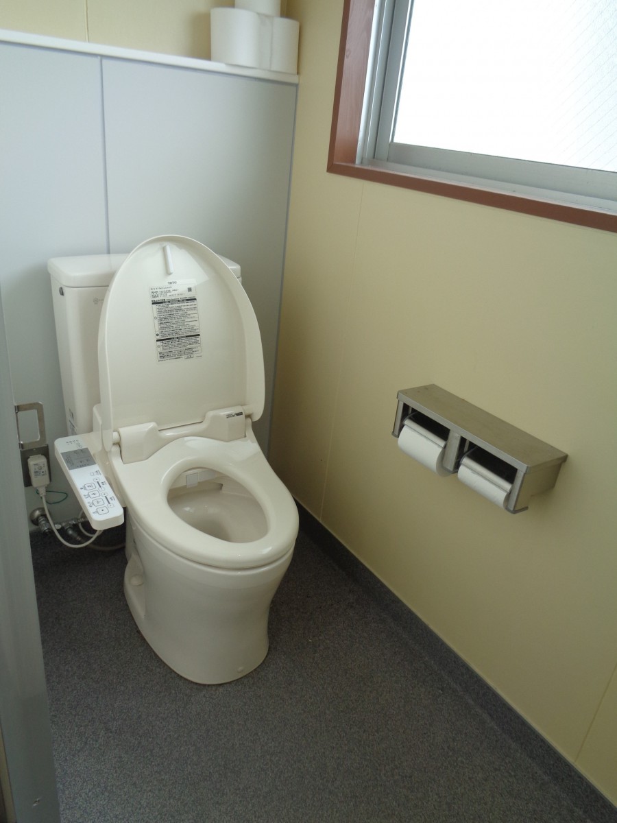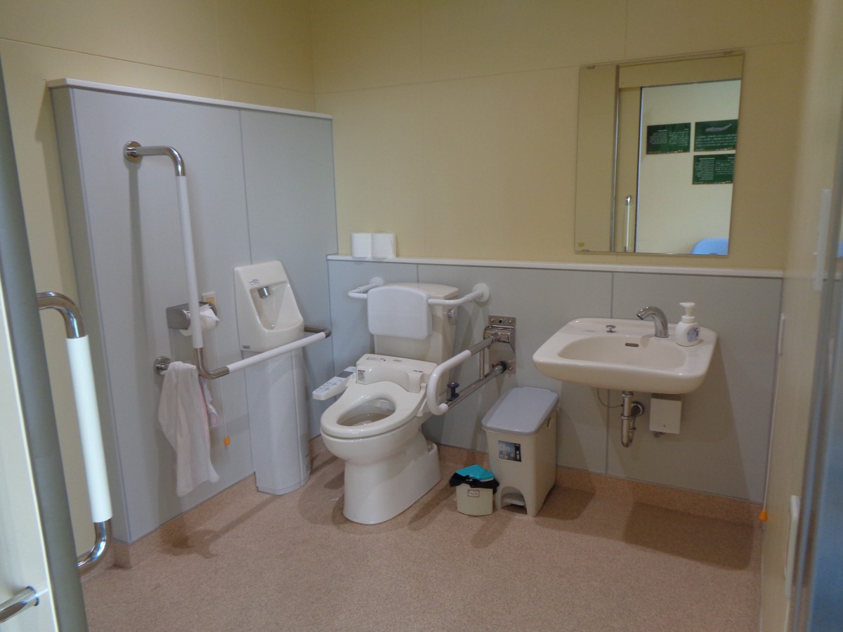 2階にある多目的トイレ スライド戸 入口幅89センチ 手すりは右側U字、左側L字あり温水洗浄便座 操作パネル便座横。