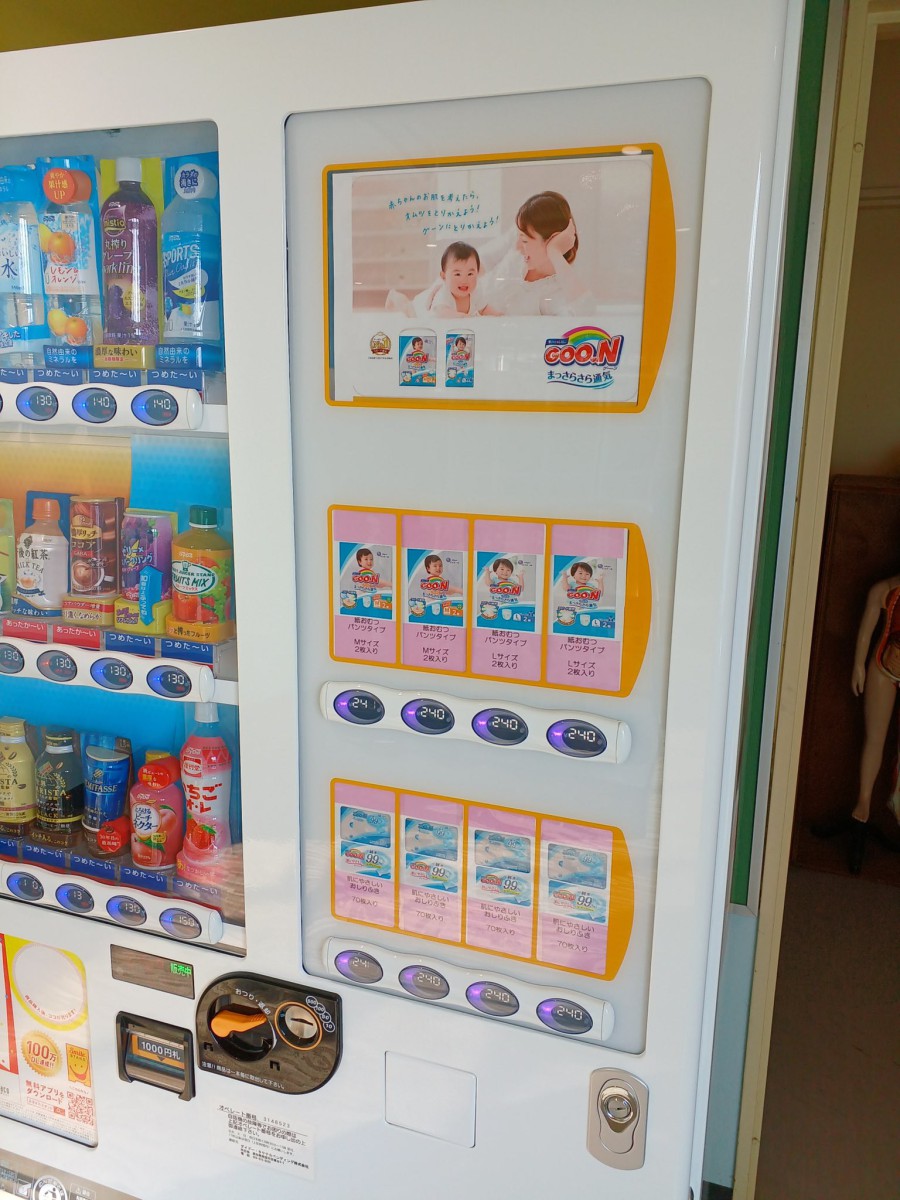 赤ちゃん用の紙おむつとおしりふきも購入できる飲料の自動販売機あり