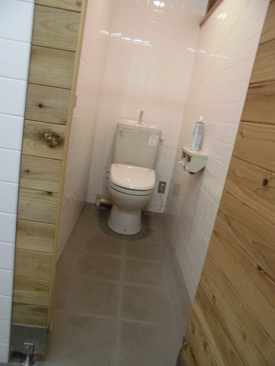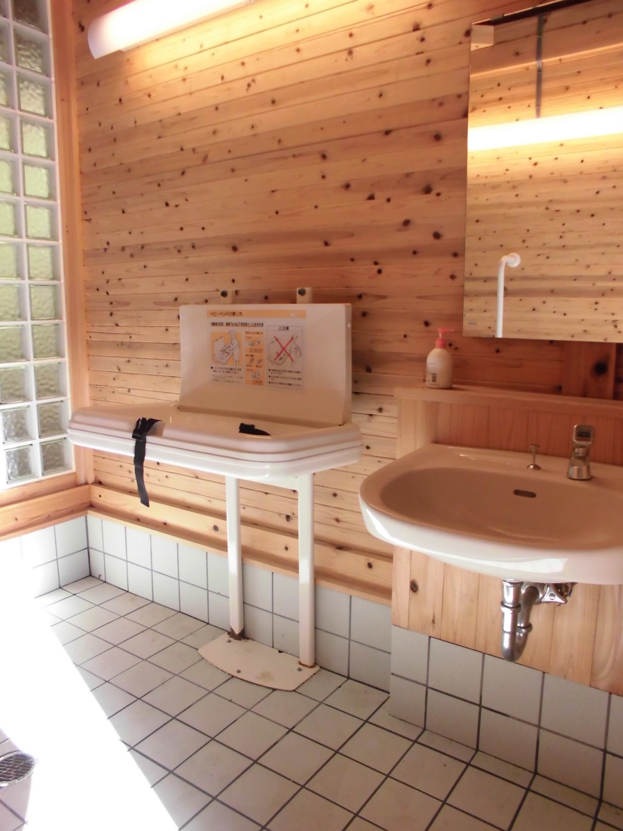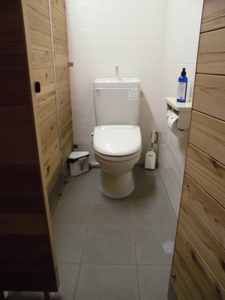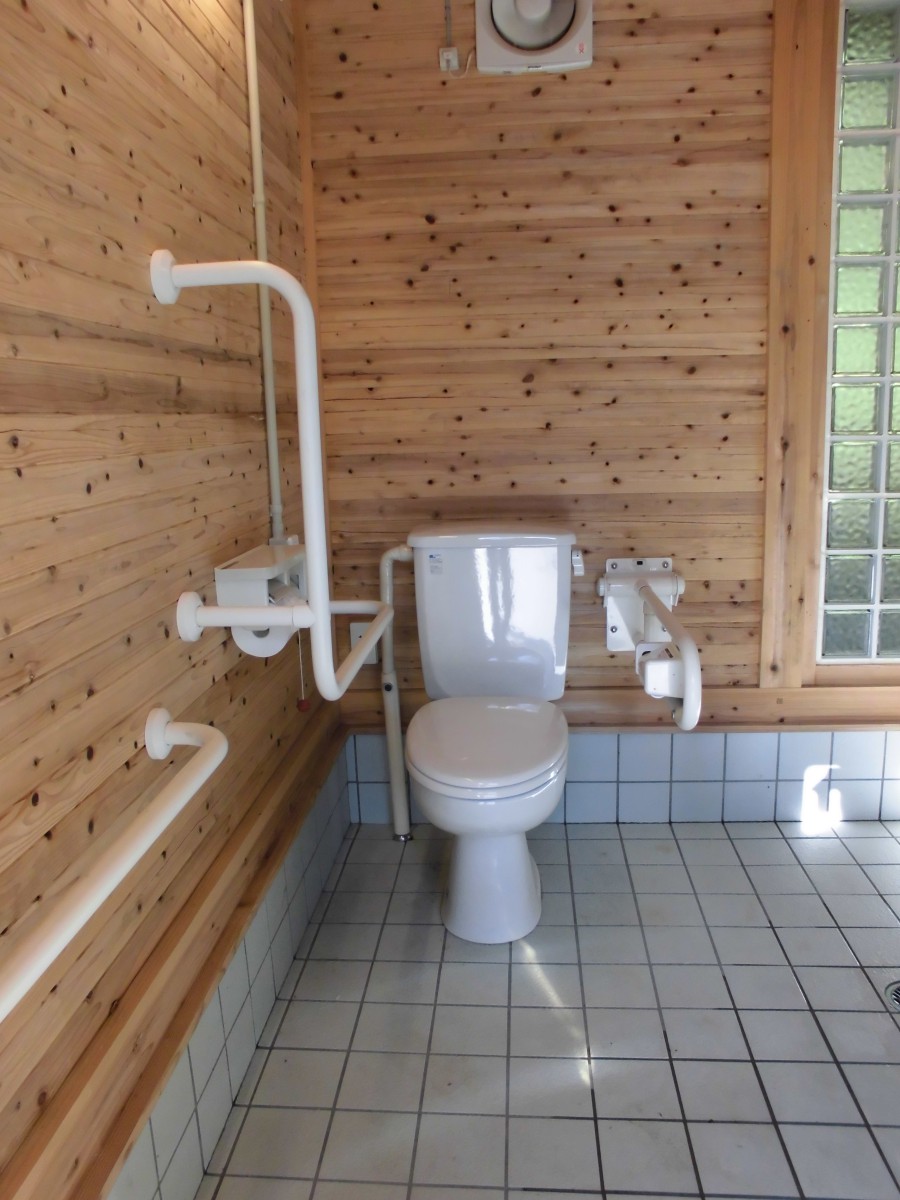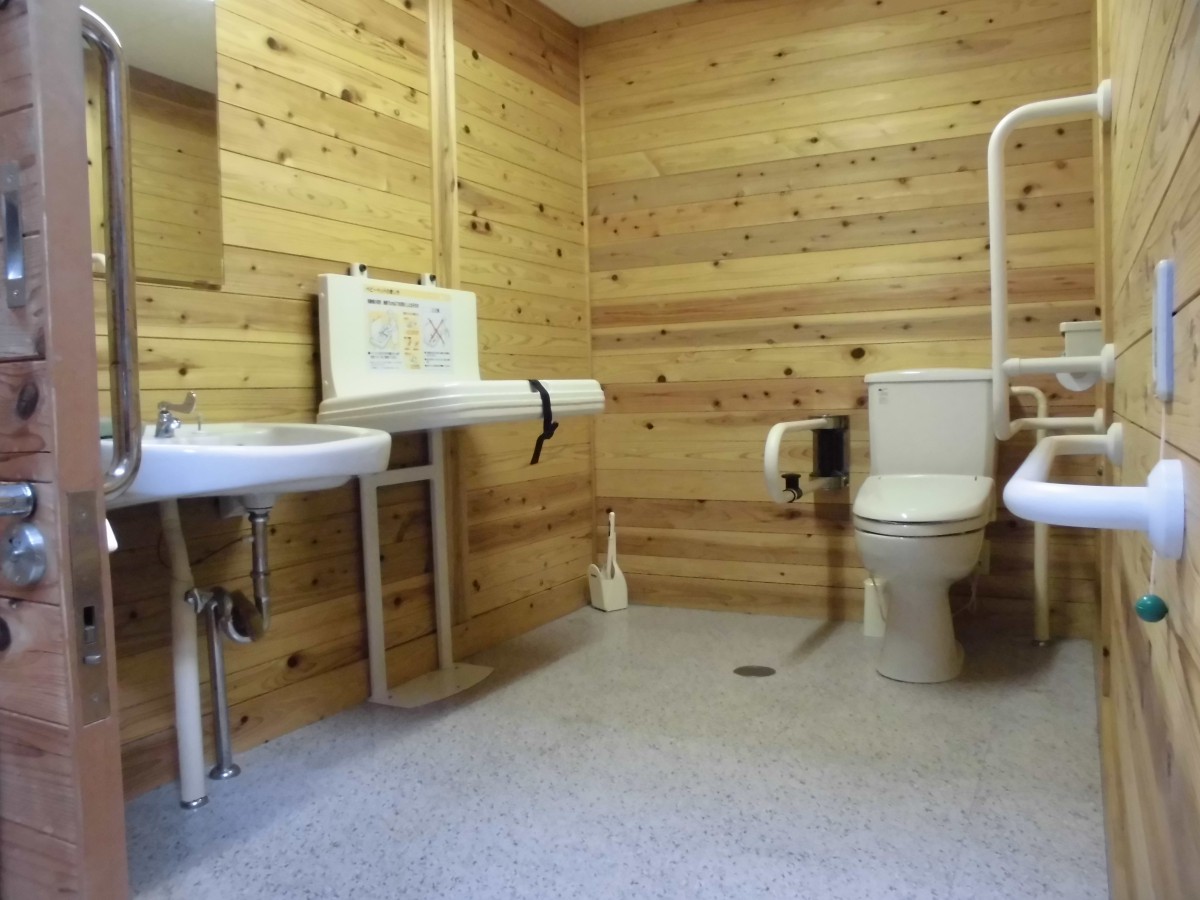 ロッジ「めじろ」 トイレと洗面台 便器に向かって左側に横I字手すりあり 洗面台高さ 下64センチ 上69センチ