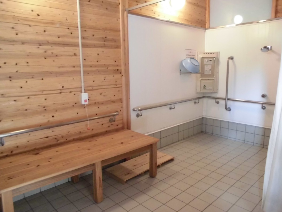 ロッジ「めじろ」浴室 スライド戸 入口幅97センチ シャワーチェアあり 浴槽奥の壁面手すりあり