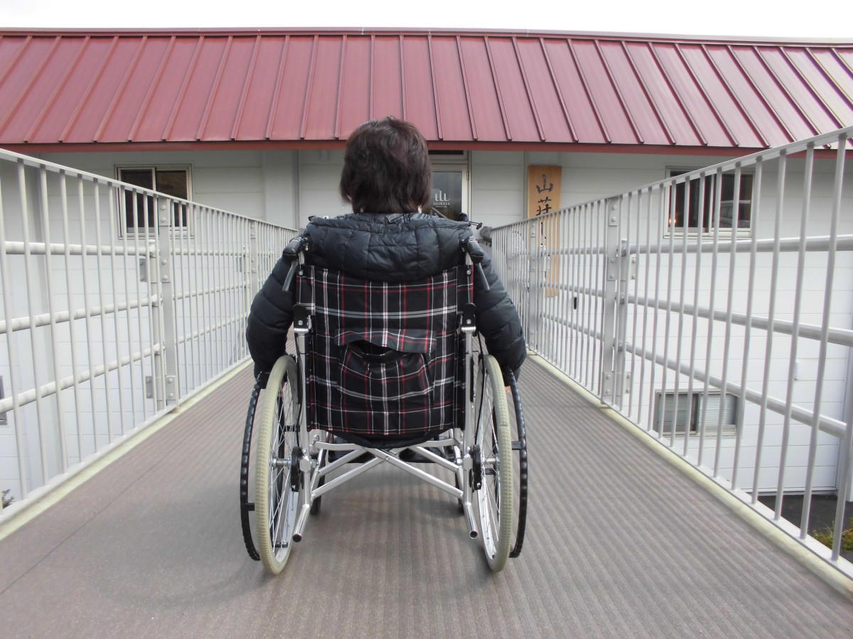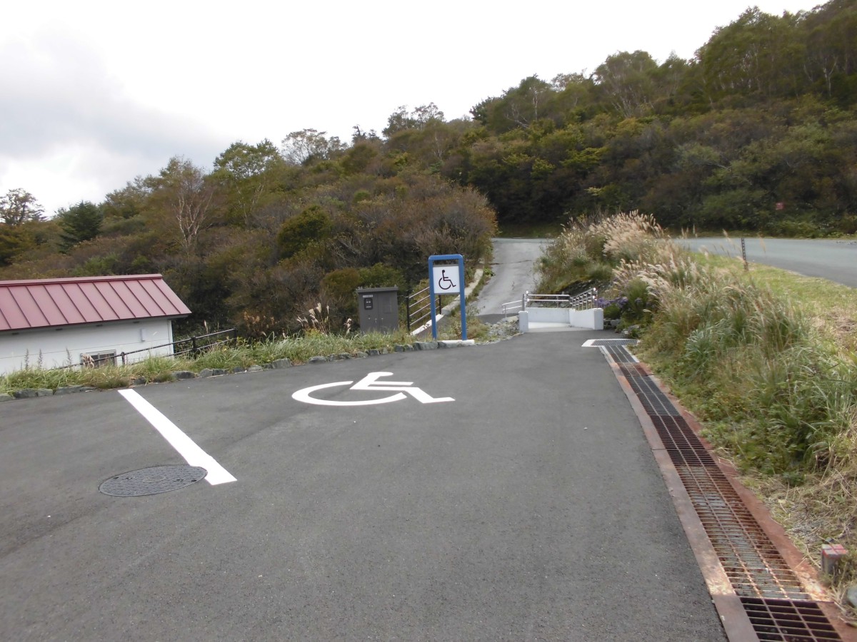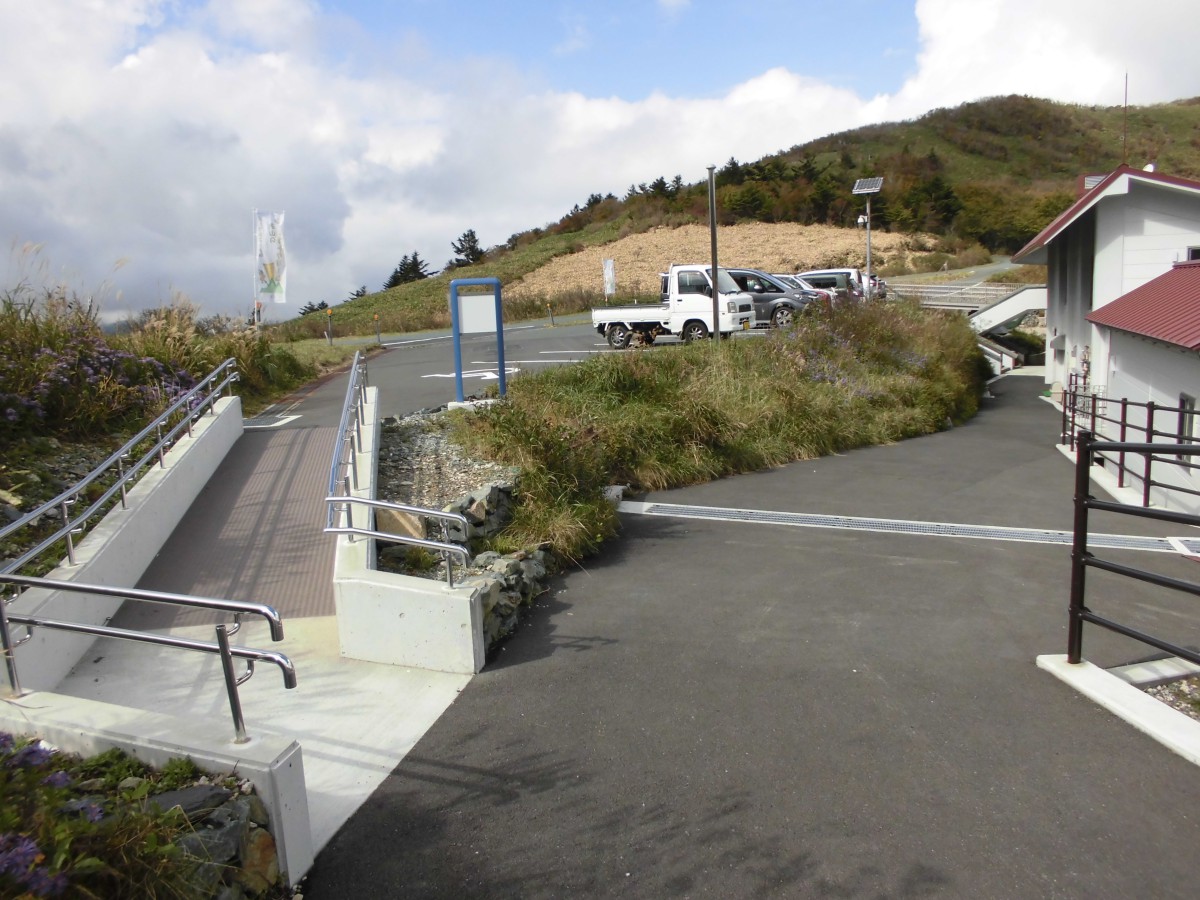駐車場から2階正面玄関への経路 スロープあり 幅121センチ、長さ635センチ 傾度5度 両側に手すりあり その先下り坂あり 傾度5~6度