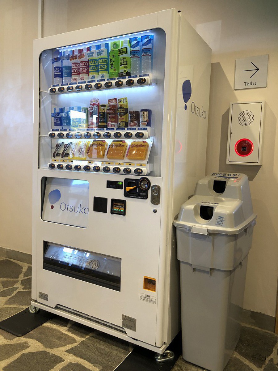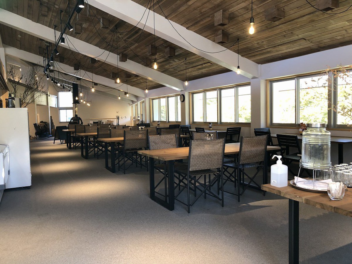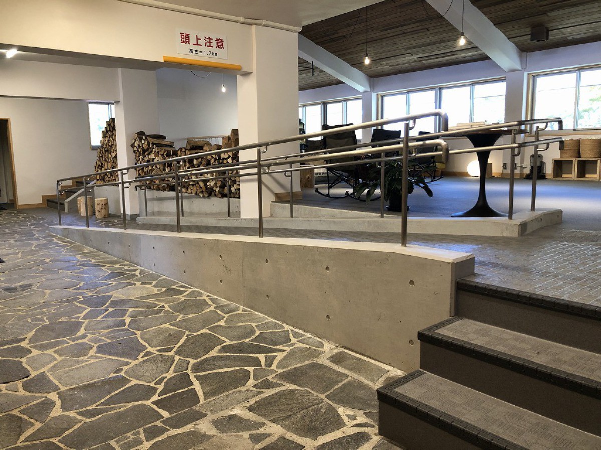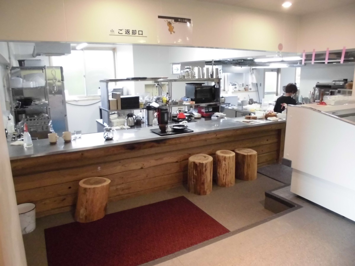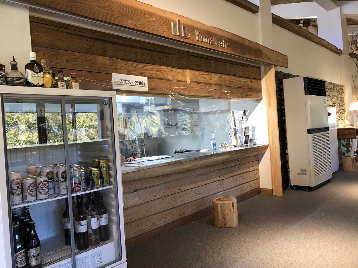 2階受付 山カフェ 注文・会計カウンター 高さ92センチ 宿泊受付もこちらで行っている