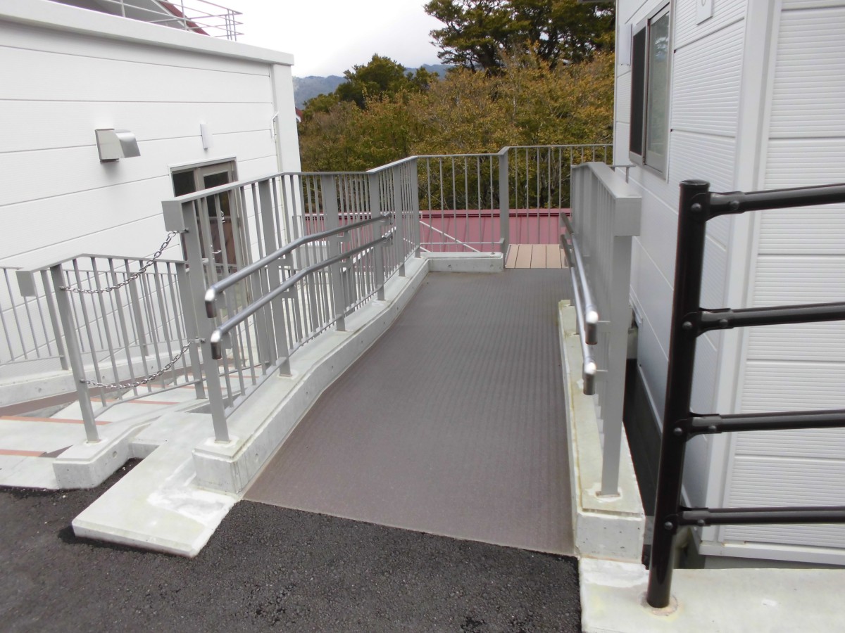 ロッジ6バリアフリールーム前スロープ 幅124センチ 長さ148センチ 傾度4度