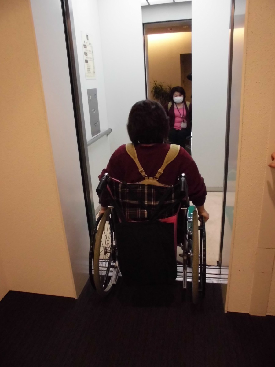 エレベーター 入口幅90センチ 手すり、点字、音声案内、階数表示、後方確認用鏡あり