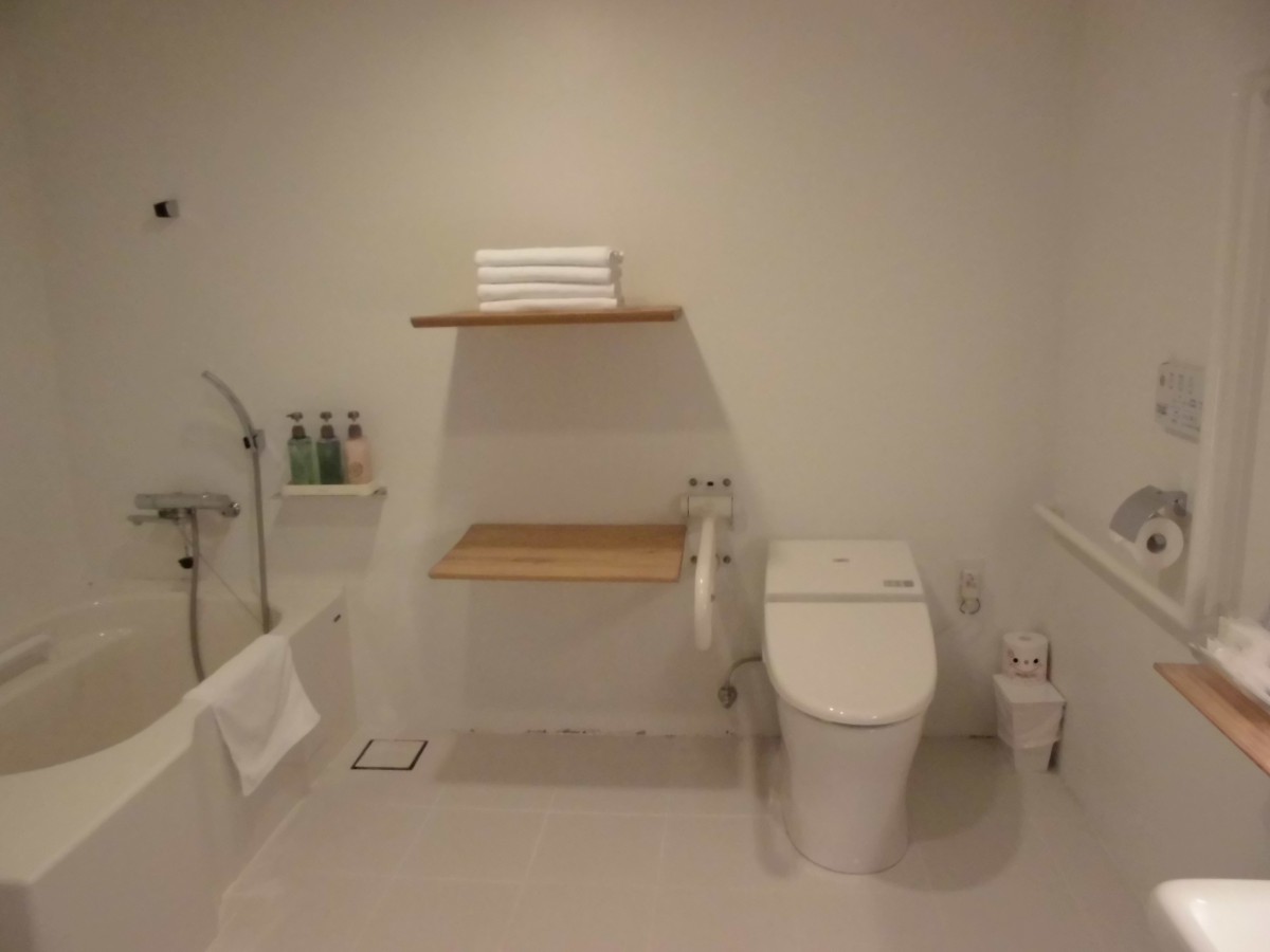 101号室バリアフリールーム 浴室・トイレ・洗面共通入口 スライド戸 入口幅79センチ 浴槽奥に手すりあり 浴槽に腰を掛けるスペースあり 便器に向かって右にL字固定、左にU字可動式の手すりあり
