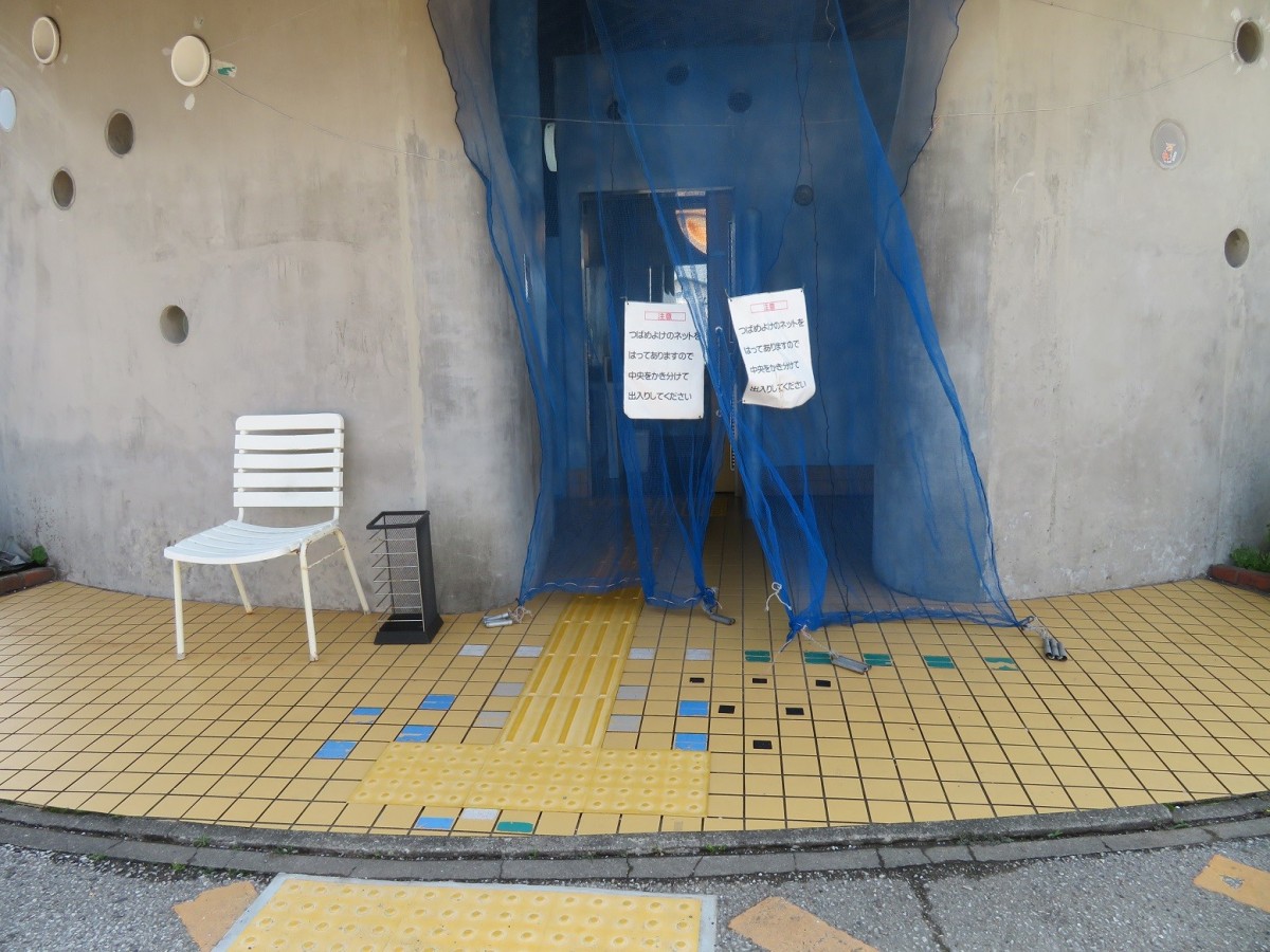 トイレ棟 入口幅155センチ 雨などで濡れている時は滑りやすいため要注意 春から夏まで入口は燕除けのネットで覆われている