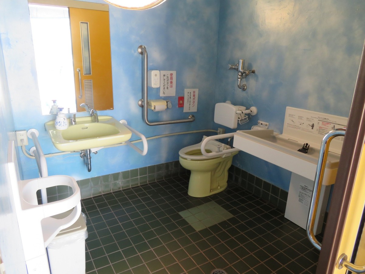 トイレ棟 多目的トイレ スライド戸 入口幅85センチ 便器に向かって右側にU字可動式、左側にL字固定手すりあり ベビーシート、ベビーチェアあり