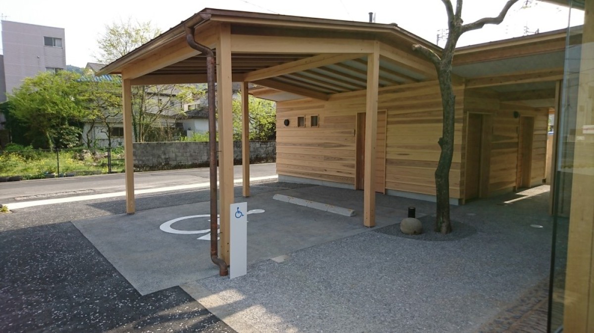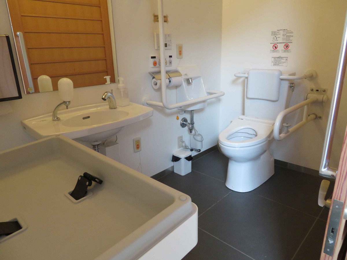 屋外多目的トイレ スライド戸 入口幅92センチ 縦幅150センチ横幅98センチ 便器に向かって右に可動式U字、左に固定L手すりあり ベビーシートあり