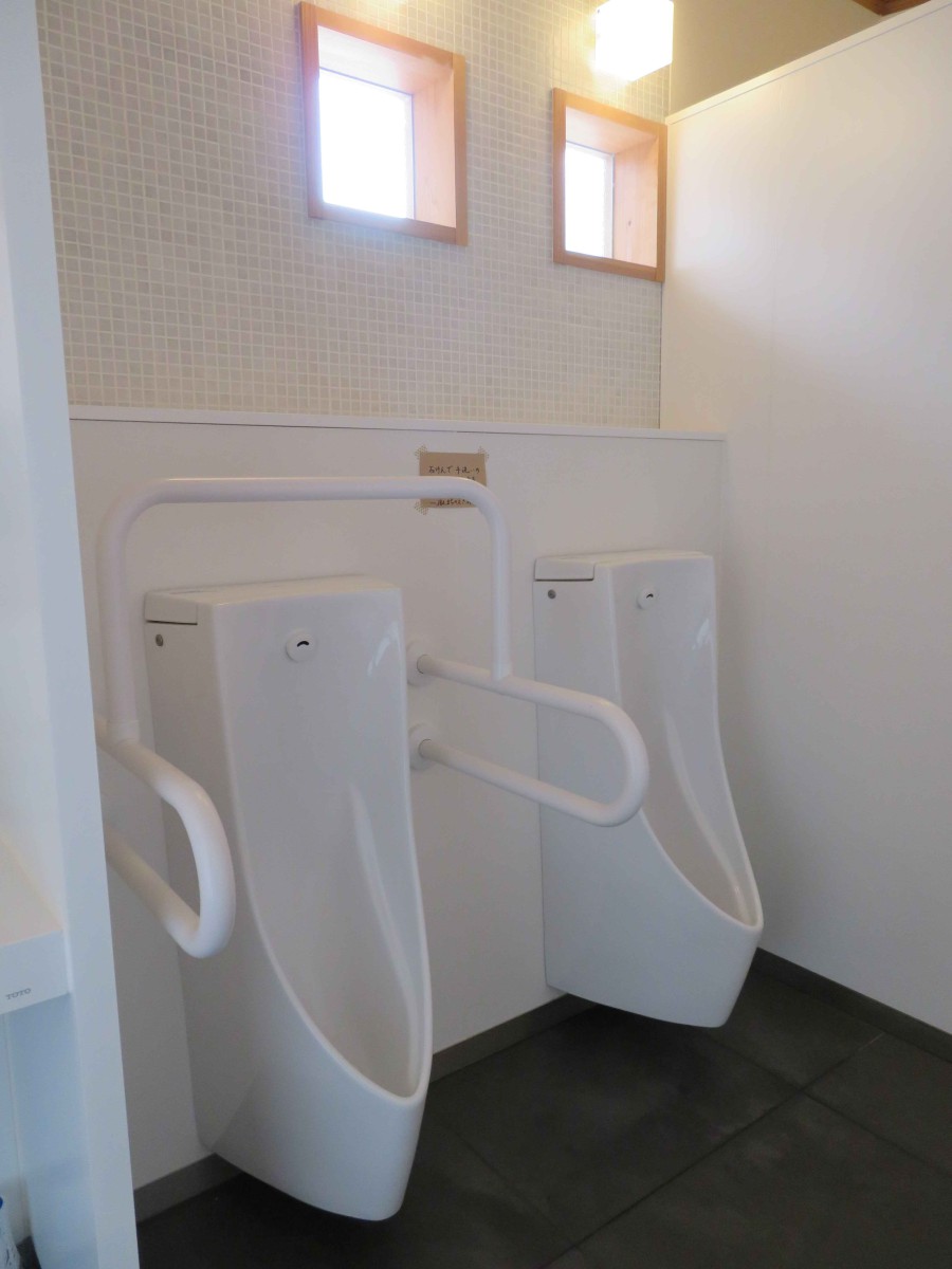 屋外女性用一般トイレ ドア幅49センチ 一番奥のみ便器に向かって右にL字固定手すりあり 男性用も同じ
