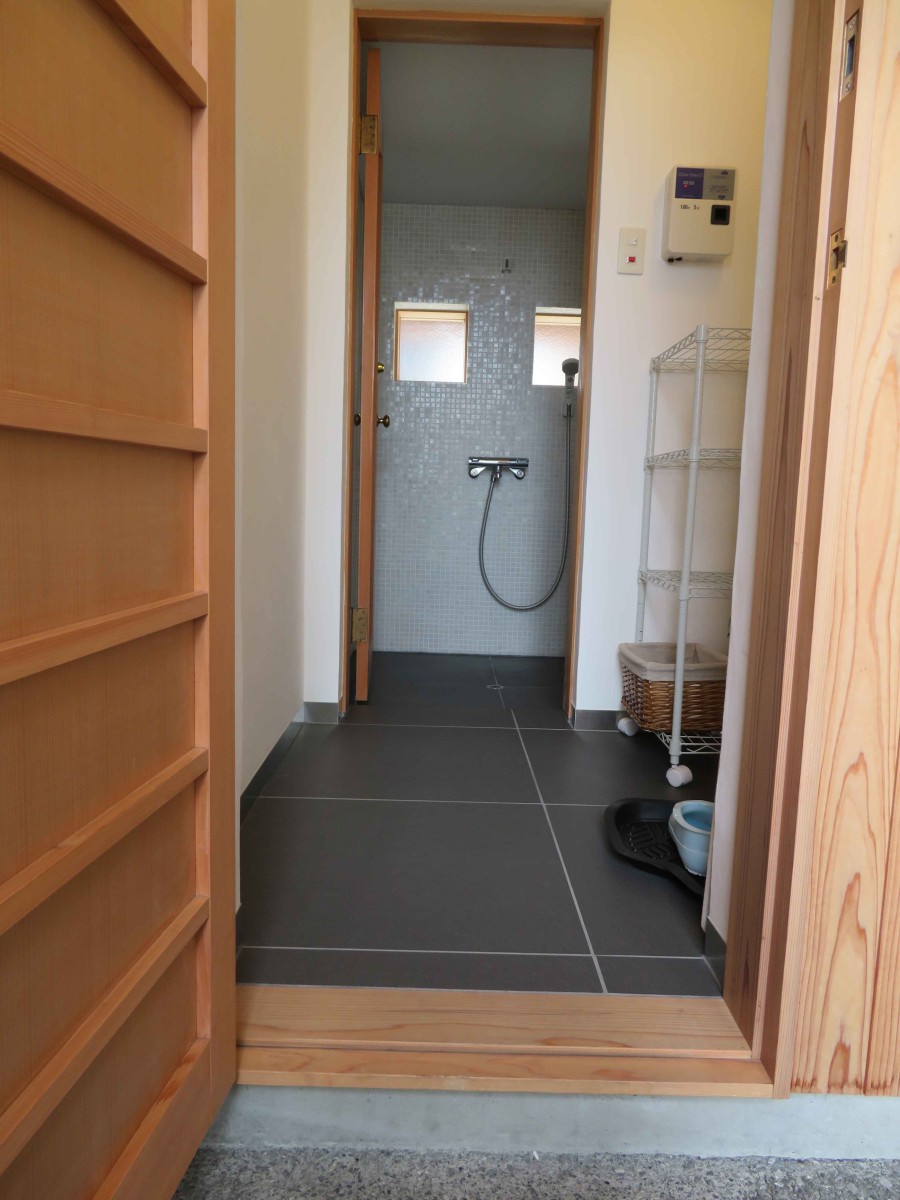 シャワー室 開き戸 入口幅61センチ 段差あり高さ15センチ