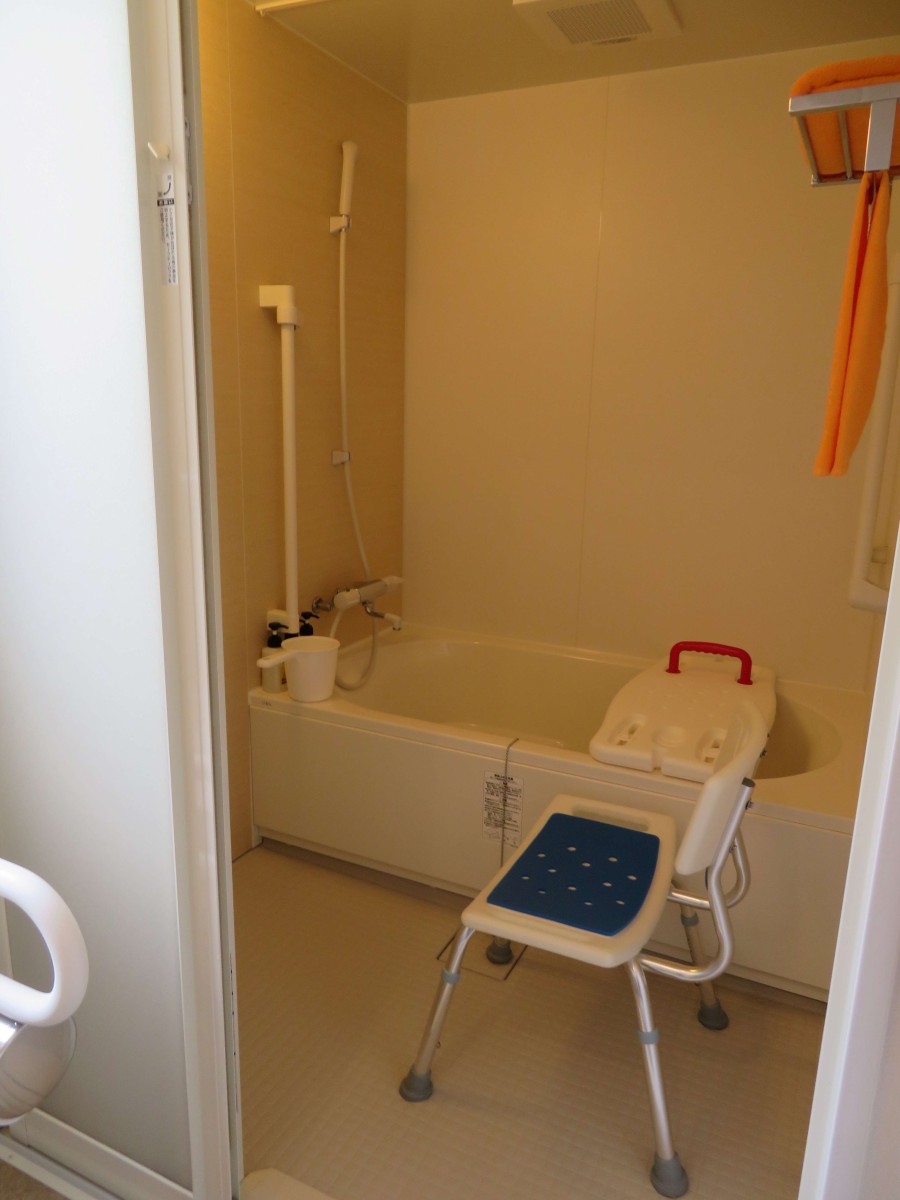 1階16号室バリアフリールーム 浴室 スライド戸 入口幅66センチ 段差なし 浴室貸出備品 シャワーチェア、バスボード、手桶が借りられる