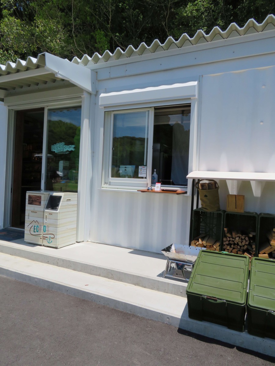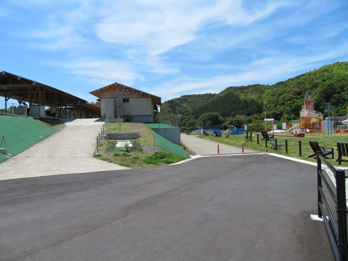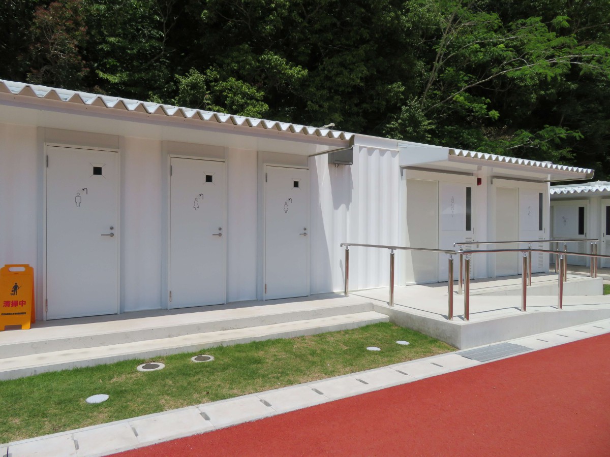 キャンプサイト 多目的トイレ 入口 スライド戸 入口幅90センチ 入口前にスロープあり 傾斜5度