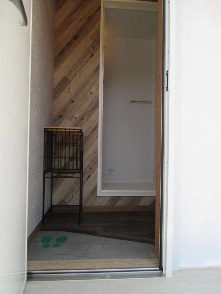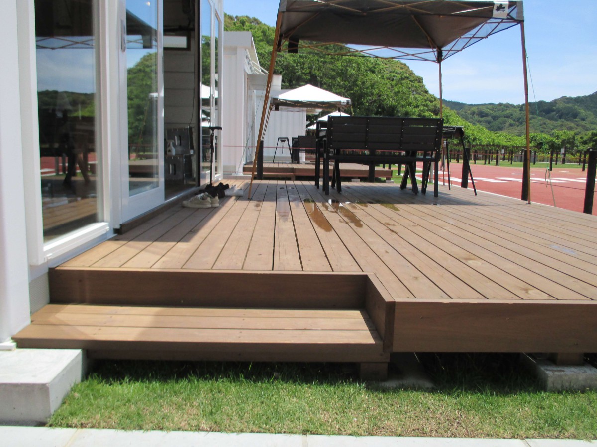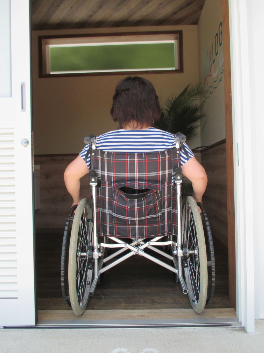 客室1号室コンテナハウス 入口前デッキ 段差あり2段 入口 スライド戸 入口幅65センチ 段差あり5.5センチ