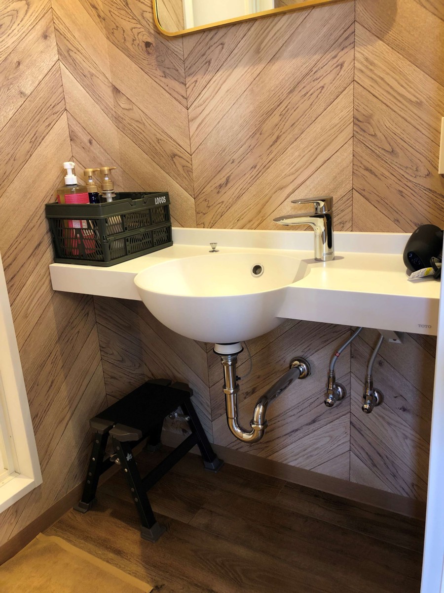 客室1号室コンテナハウス 洗面室 開き戸 入口幅65センチ 洗面台 高さ上75センチ 下68センチ