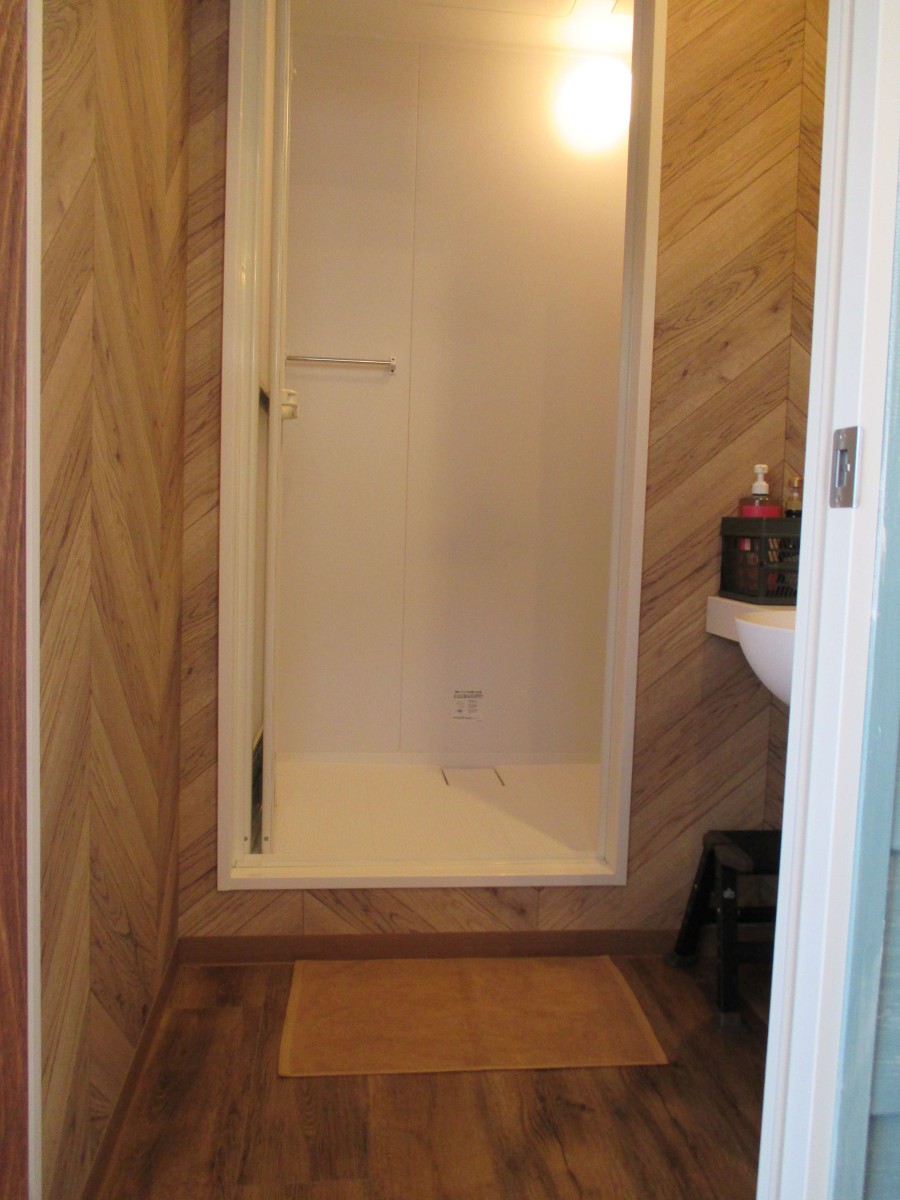 キャンプサイトシャワールーム室内 折れ戸 入口幅65センチ 段差18センチ