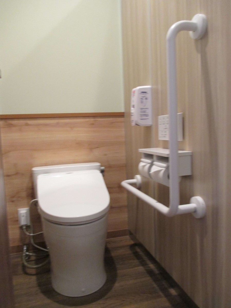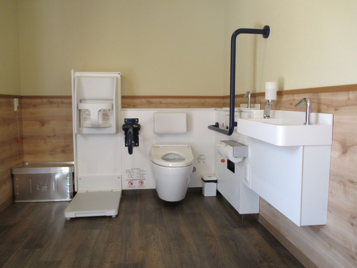 キャンプサイト 多目的トイレ 便器に向かって右側にL字、左側にU字可動式の手すりあり ベビーチェアあり