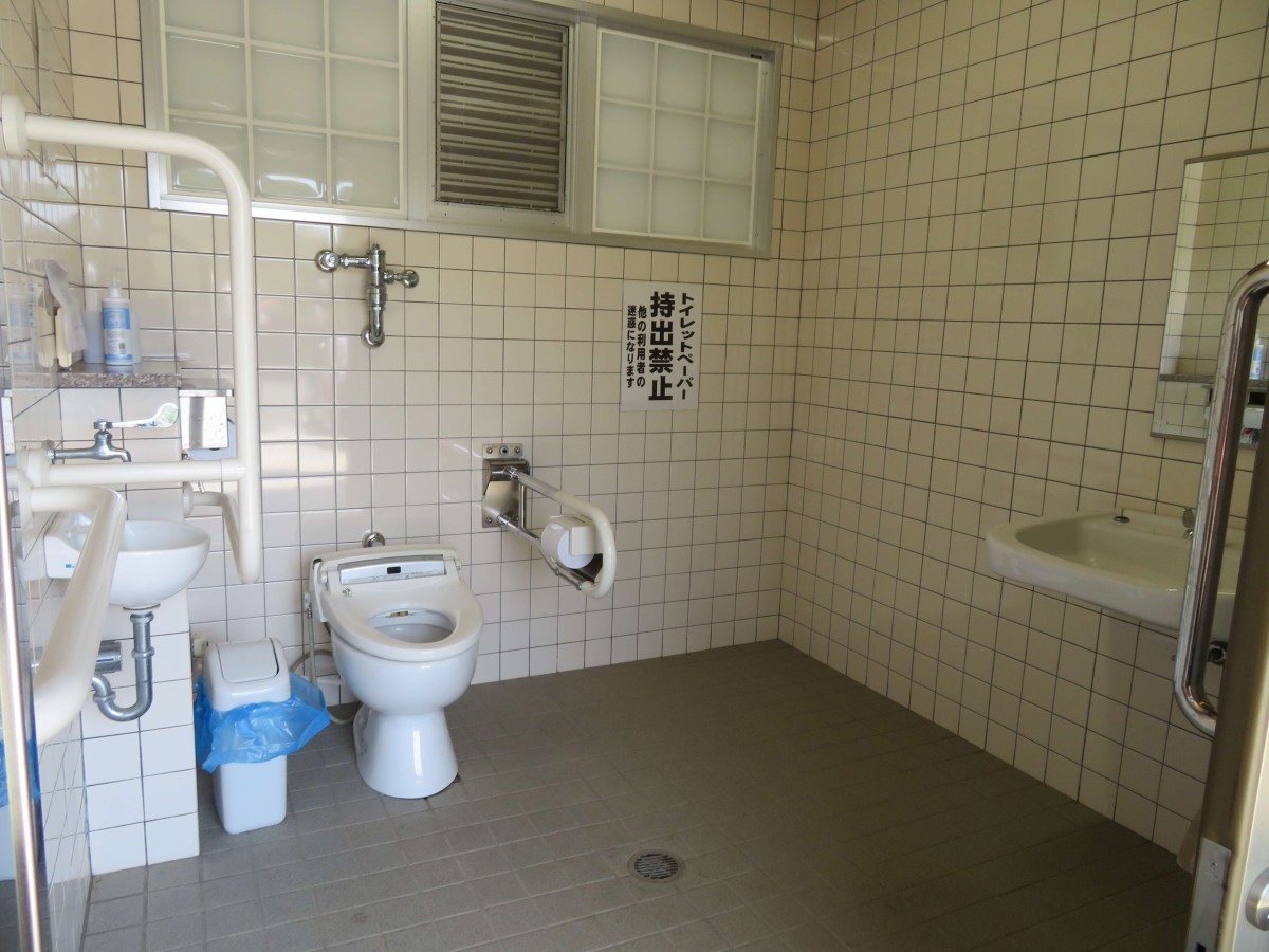 BBQスタジアム下 車いす対応トイレ スライド戸 入口幅88センチ 便器に向かって右に可動式U字、左に固定L字手すりあり