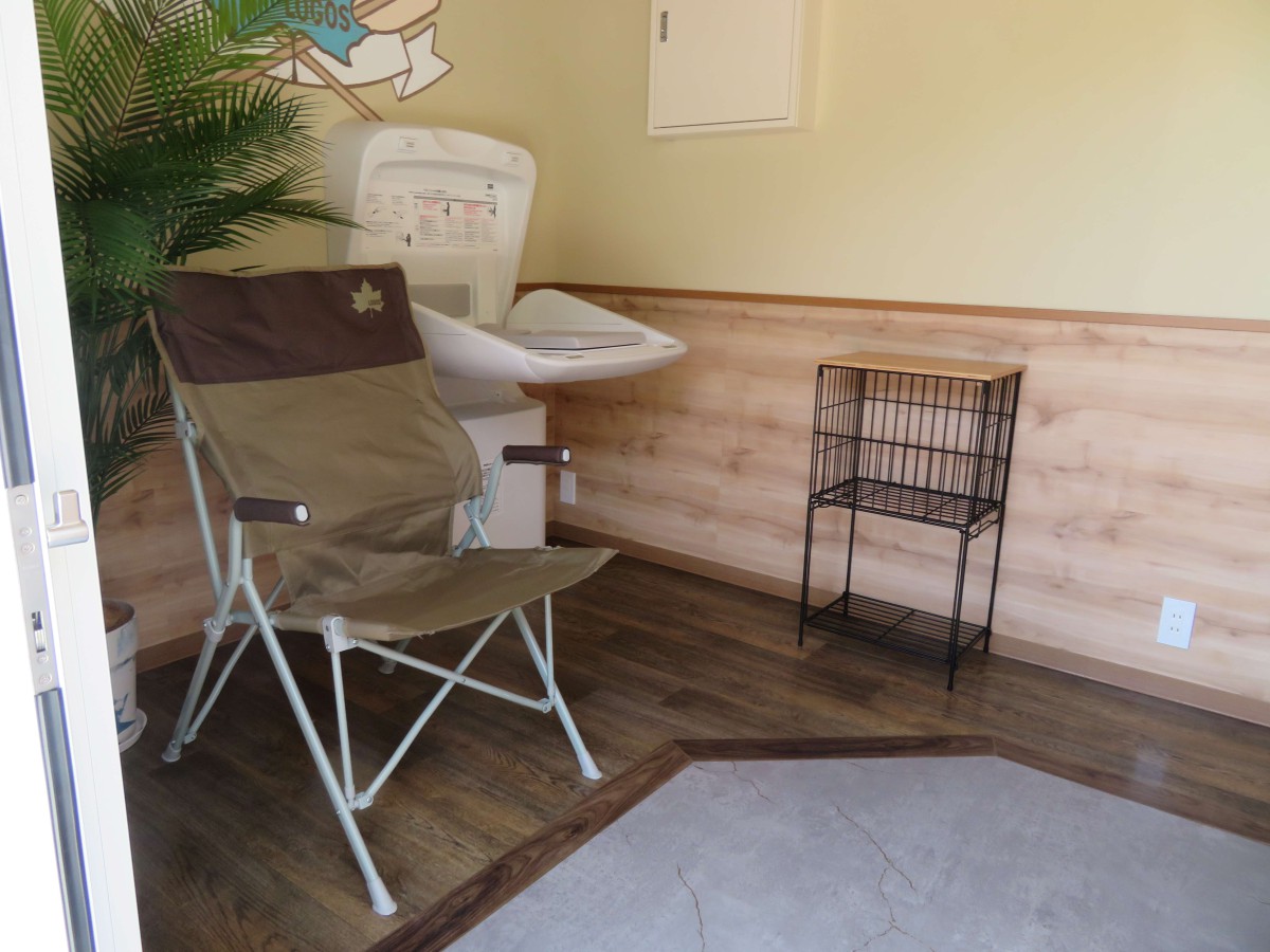 キャンプサイト 授乳室 スライド戸 入口幅88センチ 可動椅子あり 高さ47センチ ベビーシートあり 入口前にスロープあり 傾斜5度