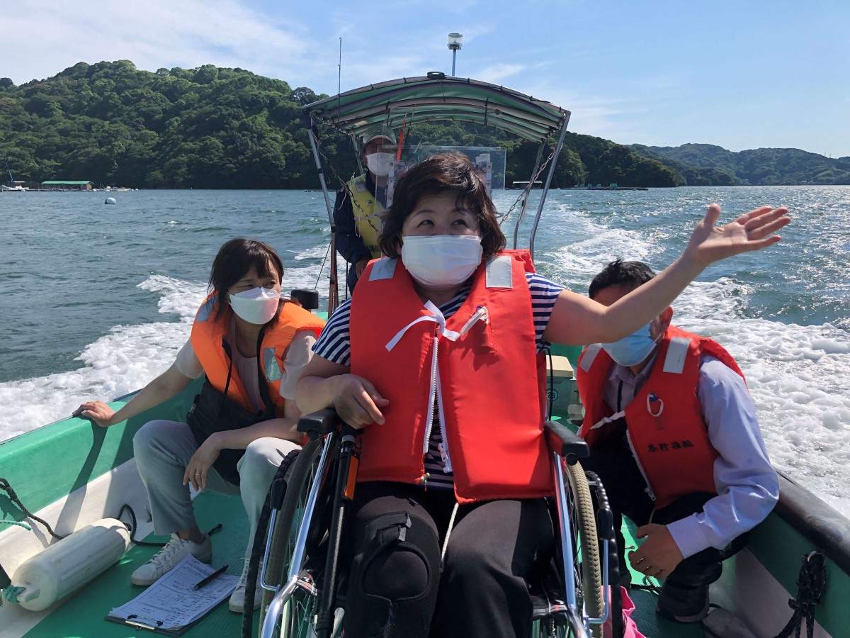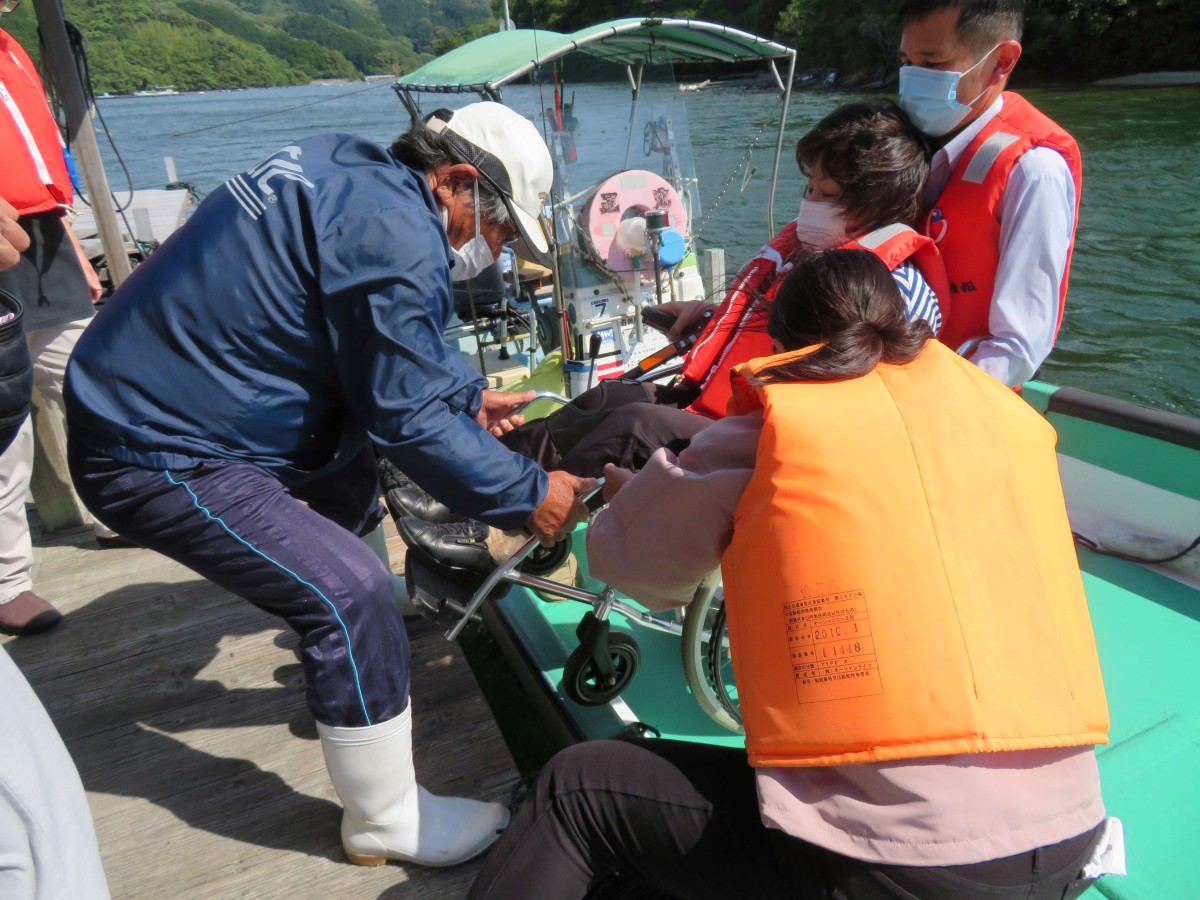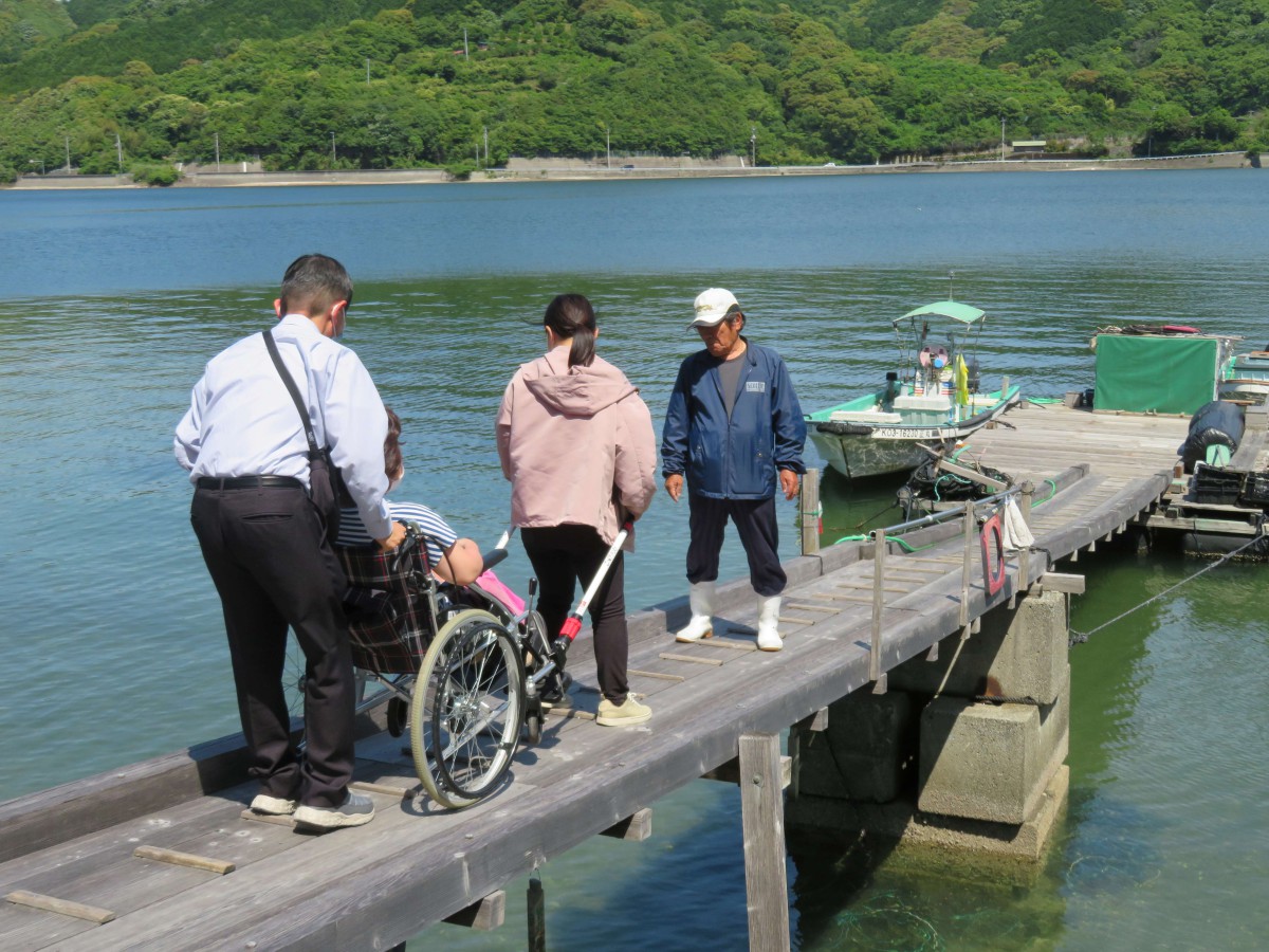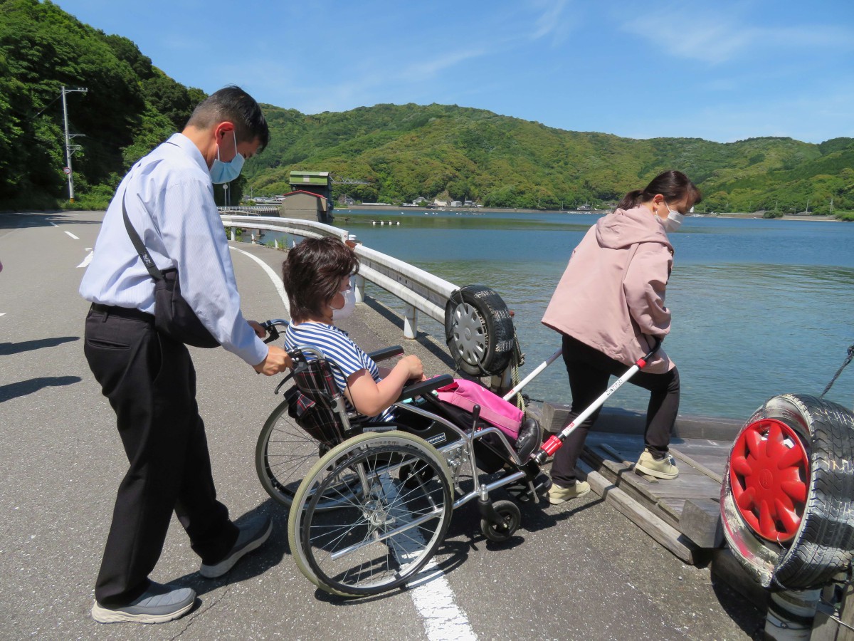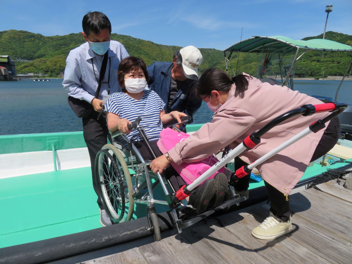 渡船場 車いすで乗り込みの様子 介助者は3名以上が望ましい