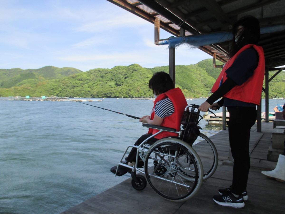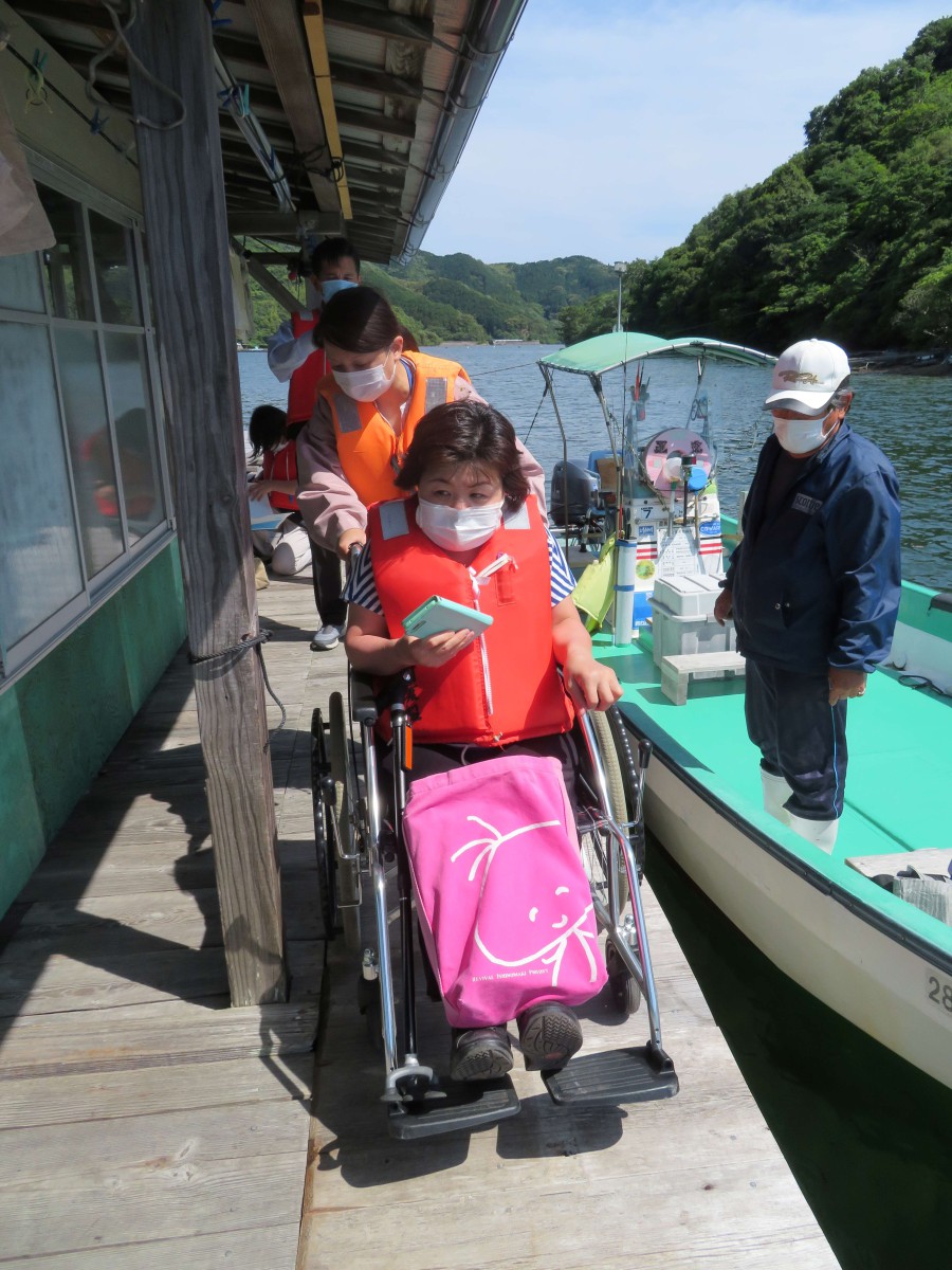 車いすで釣りイカダ乗り込みの様子 介助者が3名以上が望ましい