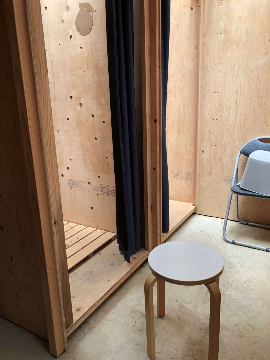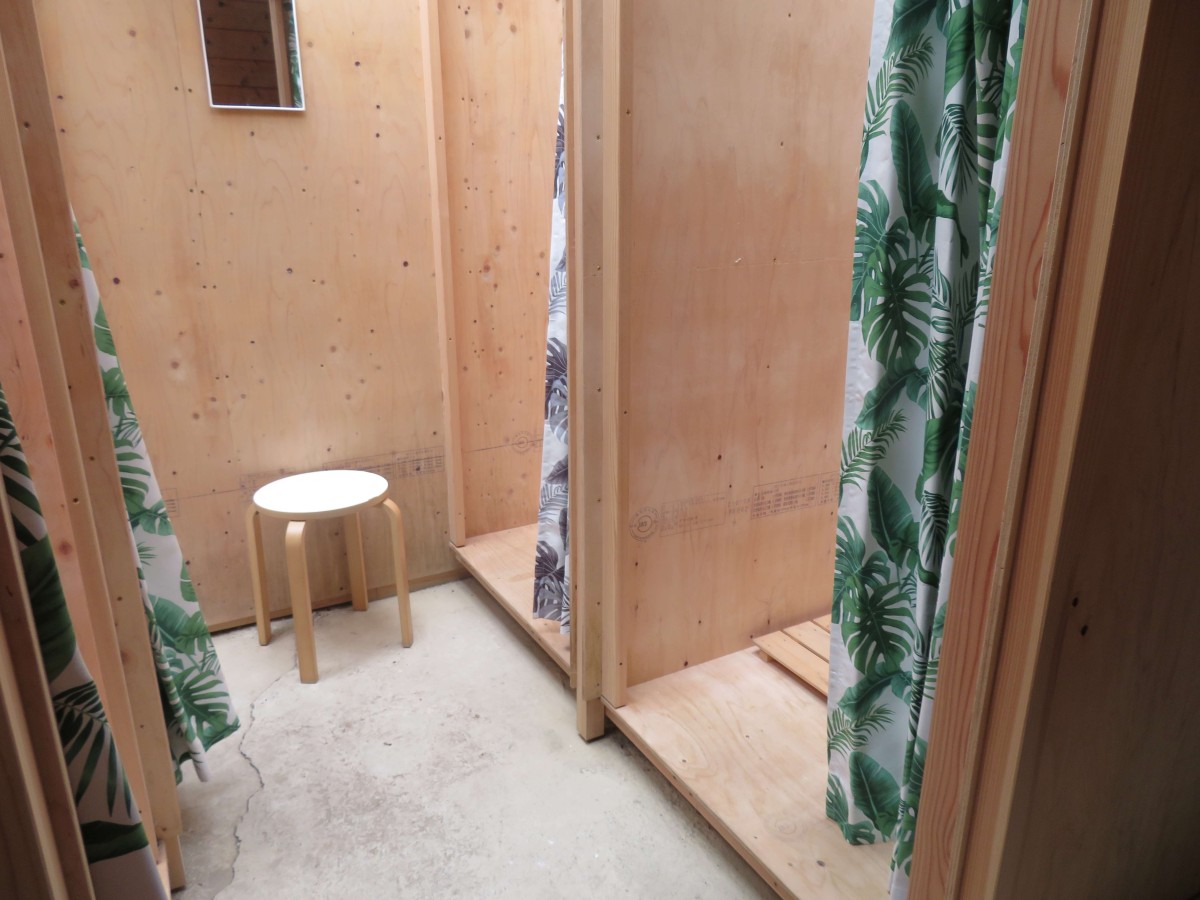 女性用更衣室 カーテン 入口幅75センチ 段差あり 段差2.5センチ 椅子の高さ44センチ