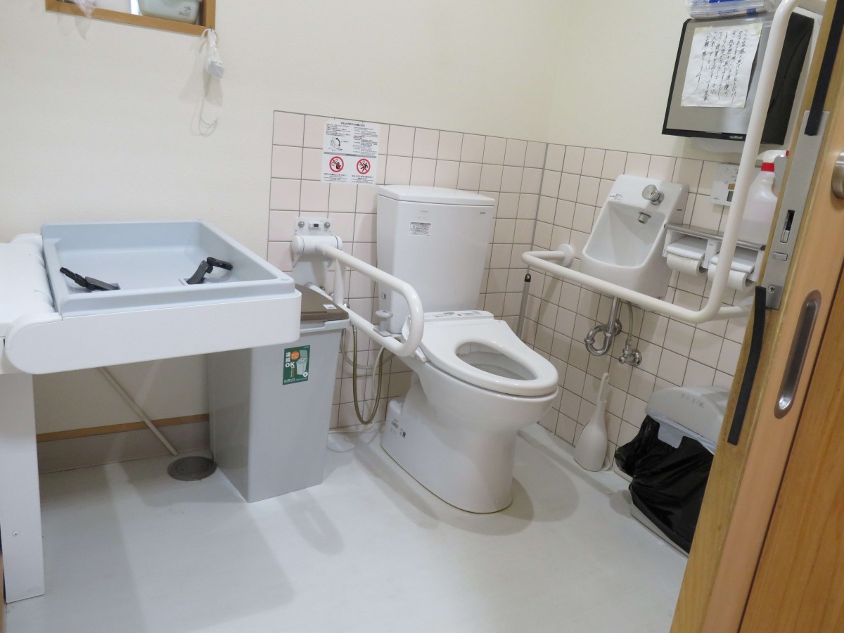 多目的トイレ 便器に向かって右側に固定L字、左側に可動U字手すりあり ベビーシートあり