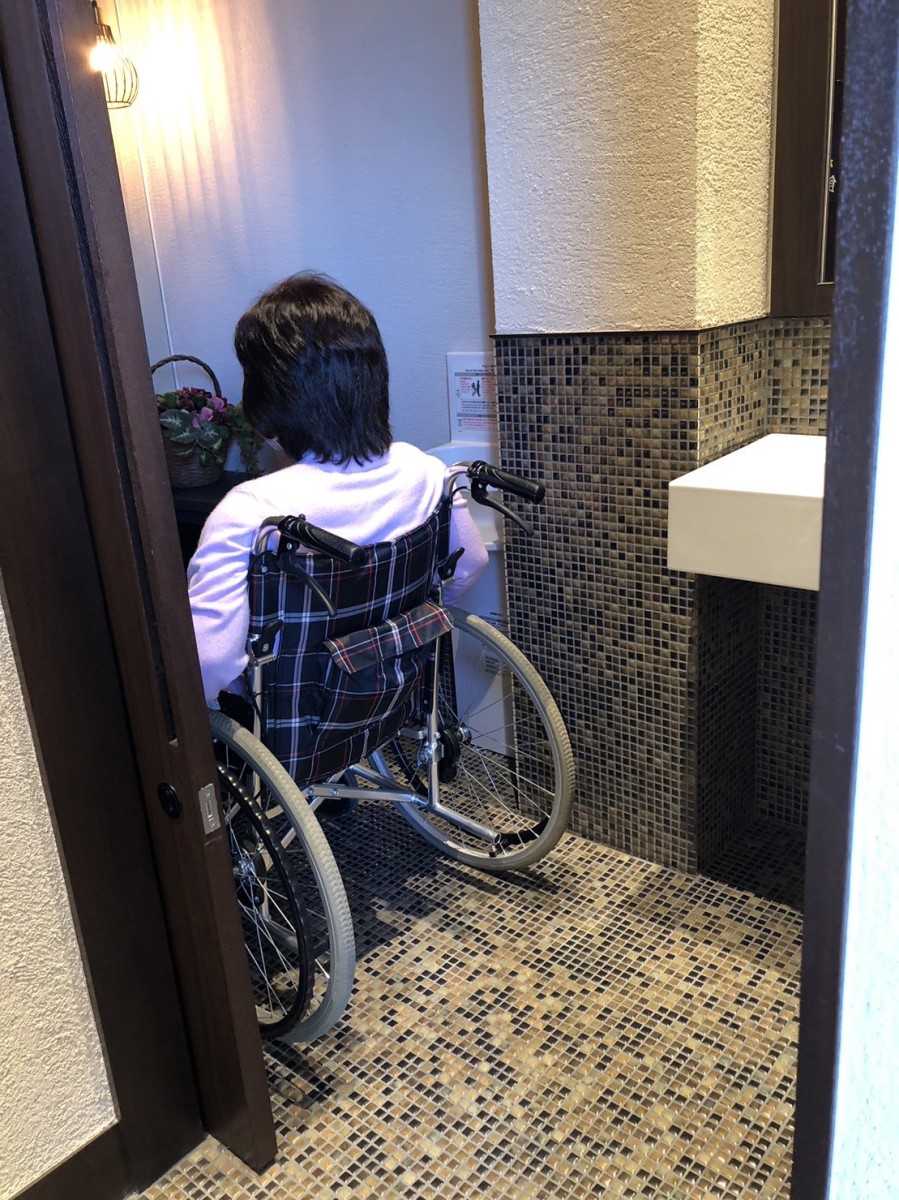 男女一般共用トイレ 便器の手前まで車いすで進めるが、有効横幅が88センチのため中で回転はできない