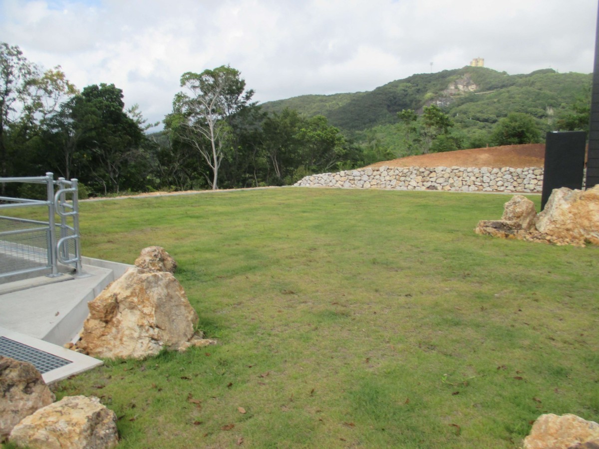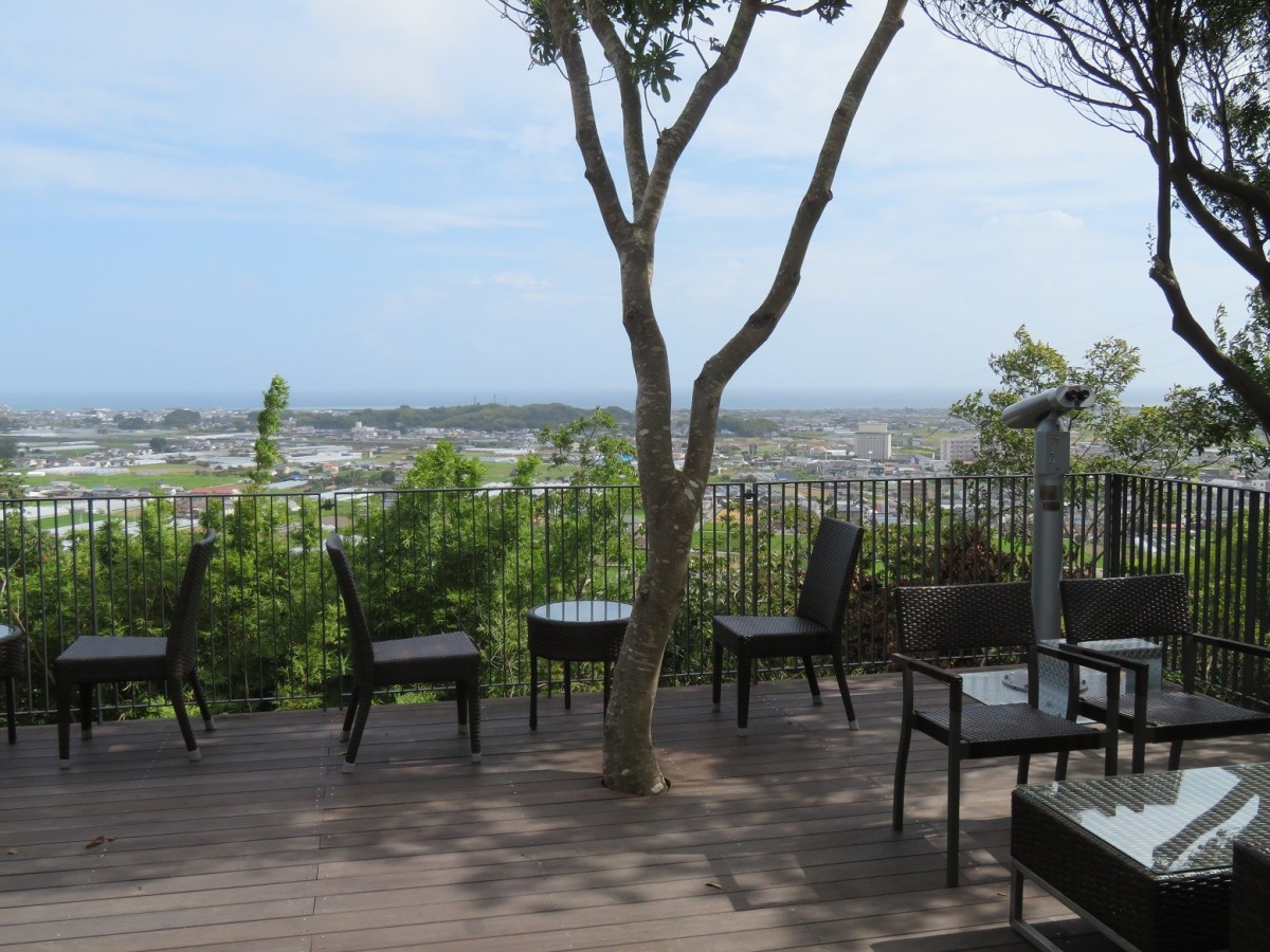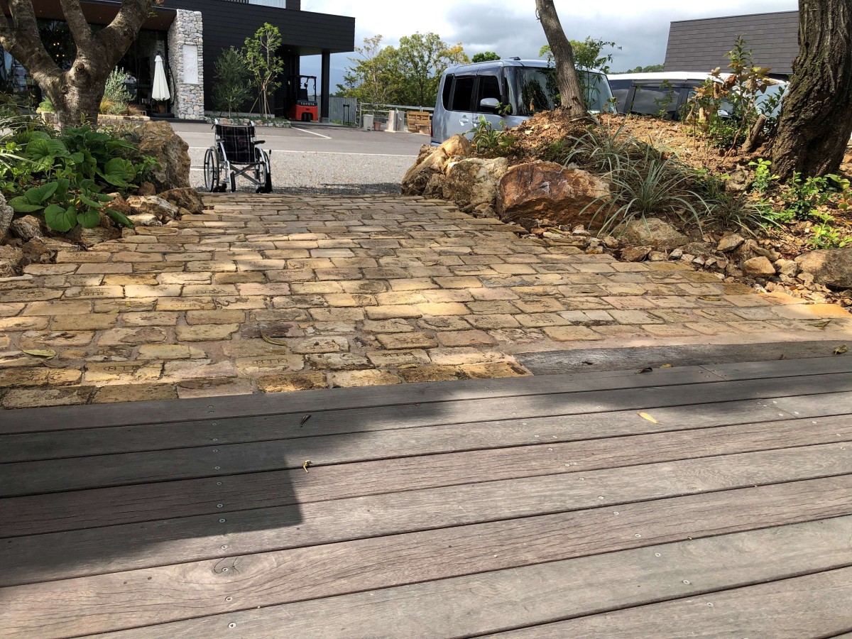 駐車場横 展望テラス 通路幅 140センチ 傾度16度 レンガ敷きのため凹凸あり