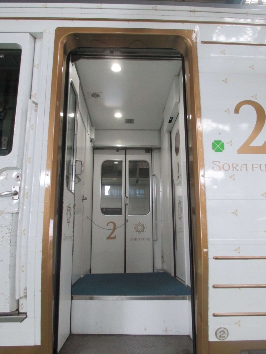 2号車ソラフネ 入口 入口幅70センチ 段差28センチ 乗降のための手すりあり