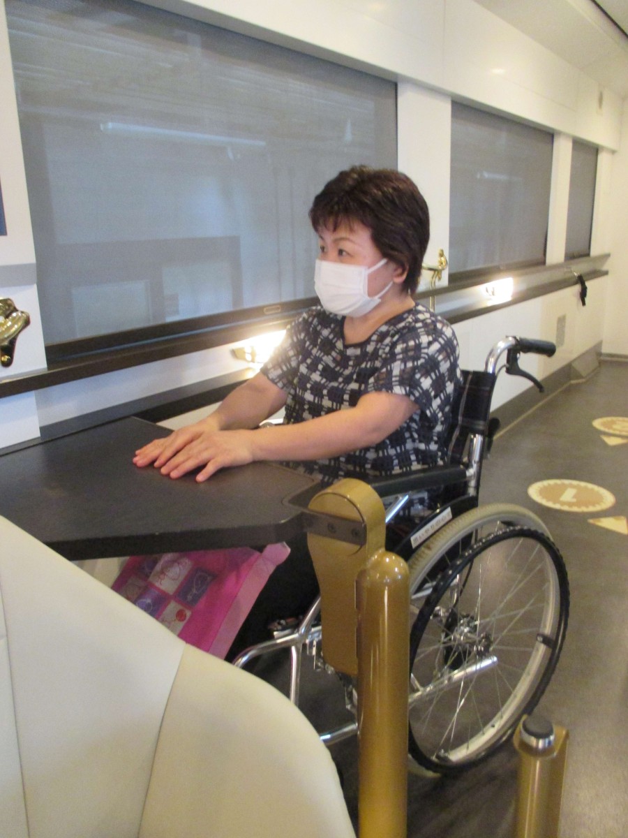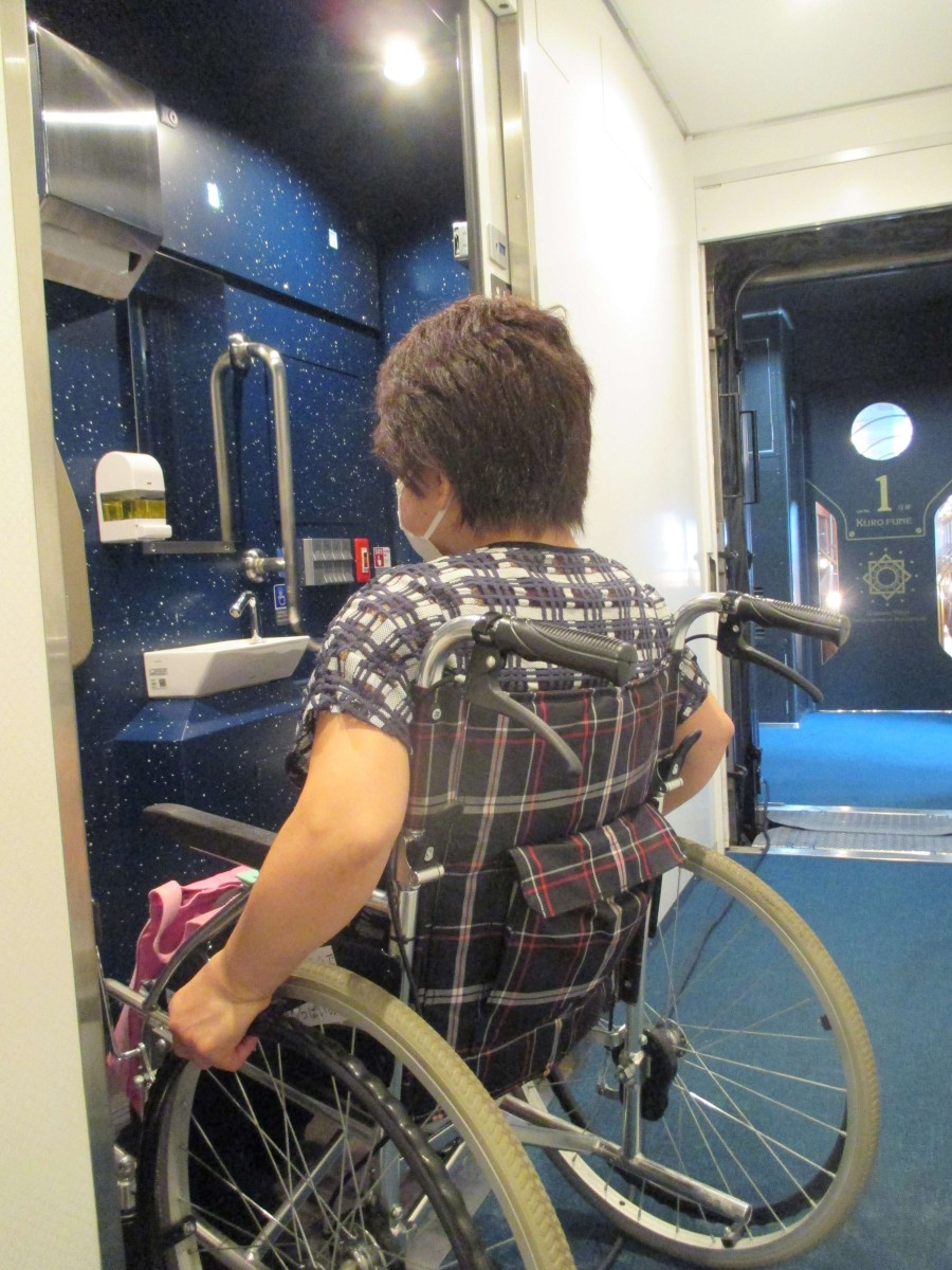 1号車クロフネ 乗車の様子 入口幅81センチ 段差28センチ 車いす利用の場合1号車から乗車となる スロープを設置し駅員や乗務員がサポート(事前連絡必要)